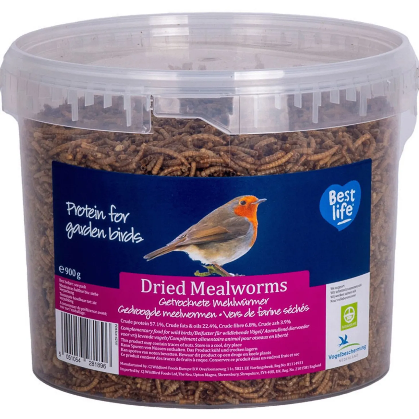 | Samenstelling | Gedroogdemeelwormenvoorvogelszijneeneiwitrijkesmakelijkevoedingvooro.a.vogelsenreptielen.Meelwormenzijneigenlijkgeenwormen,maarlarvenvandemeeltor.Meelwormenwordengekweektopeenplantaardigeveiligevoeding.Hethogeeiwitgehaltevanongeveer50%maaktmeelwormengeschiktvoorveletuinvogels.Dezegedroogdemeelwormenzijneenwaresmaaktraktatievoortuinvogels. |