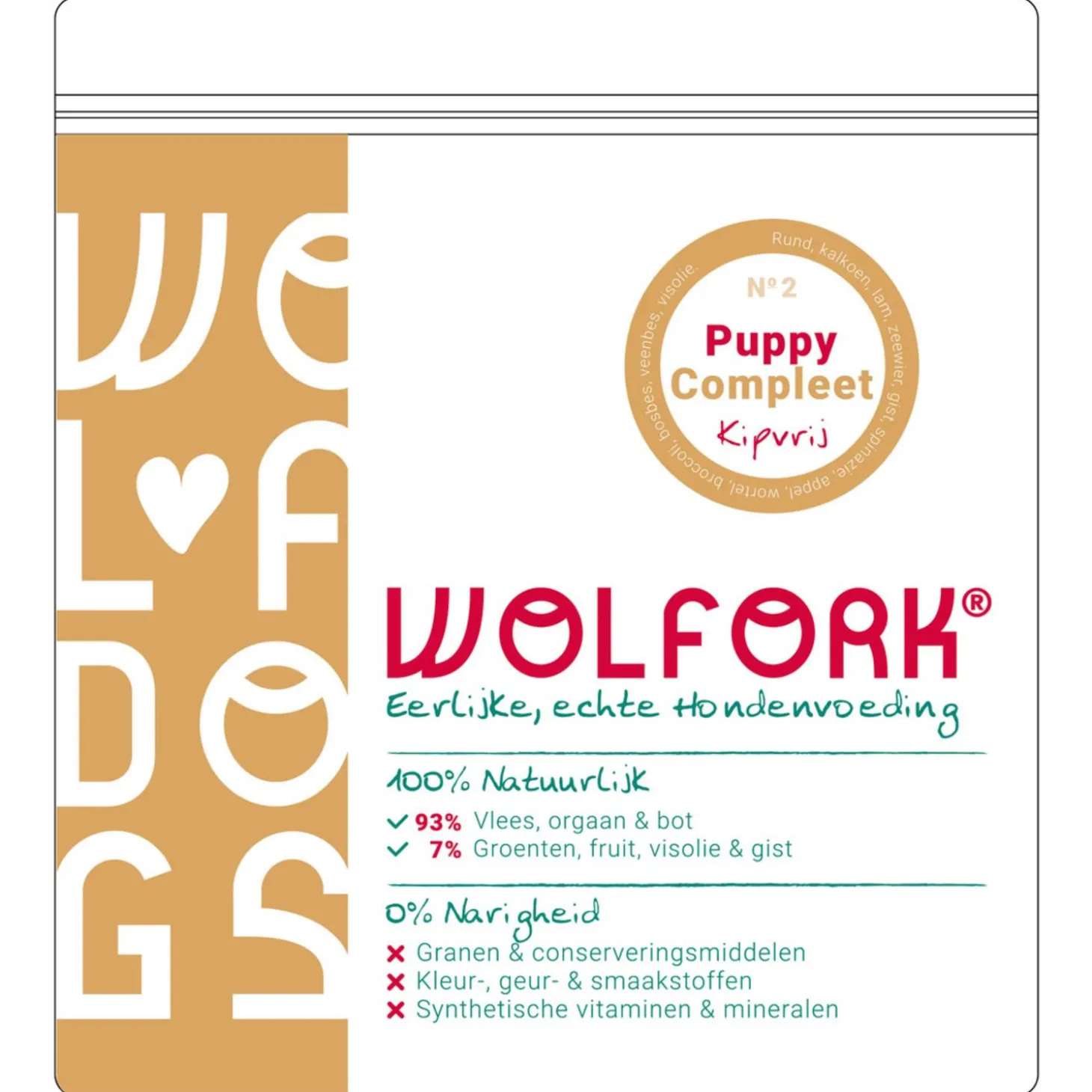 Wolfork №2 Puppy Compleet | Kipvrij biedt jouw pup alles voor een gezonde groei en sterke weerstand, met 93% vers vlees, natuurlijke ingrediënten en zonder onnodige toevoegingen. Kies voor een gezonde start en bestel vandaag nog – geef jouw pup de pure, voedzame basis die hij verdient!