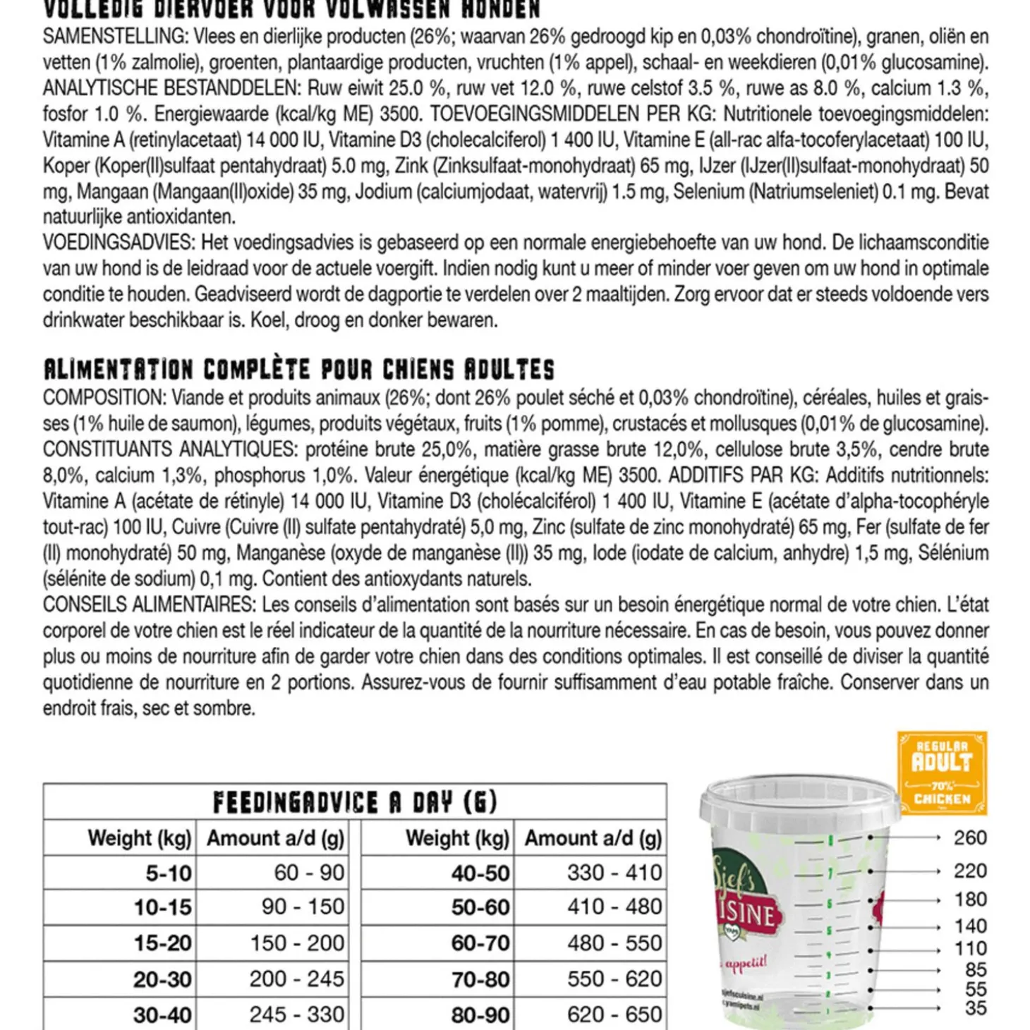 De juiste voedingsstoffen zijn essentieel voor je volwassen hond. Van de juiste voeding blijft je hond fit en zit hij lekker in z’n vel. Sjef’s Cuisine Regular Adult van Yamipets is rijk aan kip en is speciaal ontwikkeld voor de ‘normale’ hond. Regular Adult is een krokante brok.