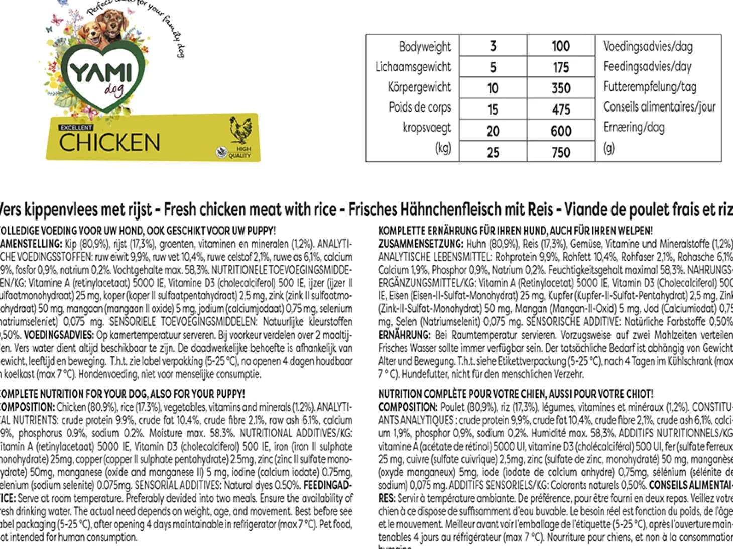 | Samenstelling | Kip (80,9%), rijst (17,3%), groenten, vitaminen en mineralen (1,2%). |