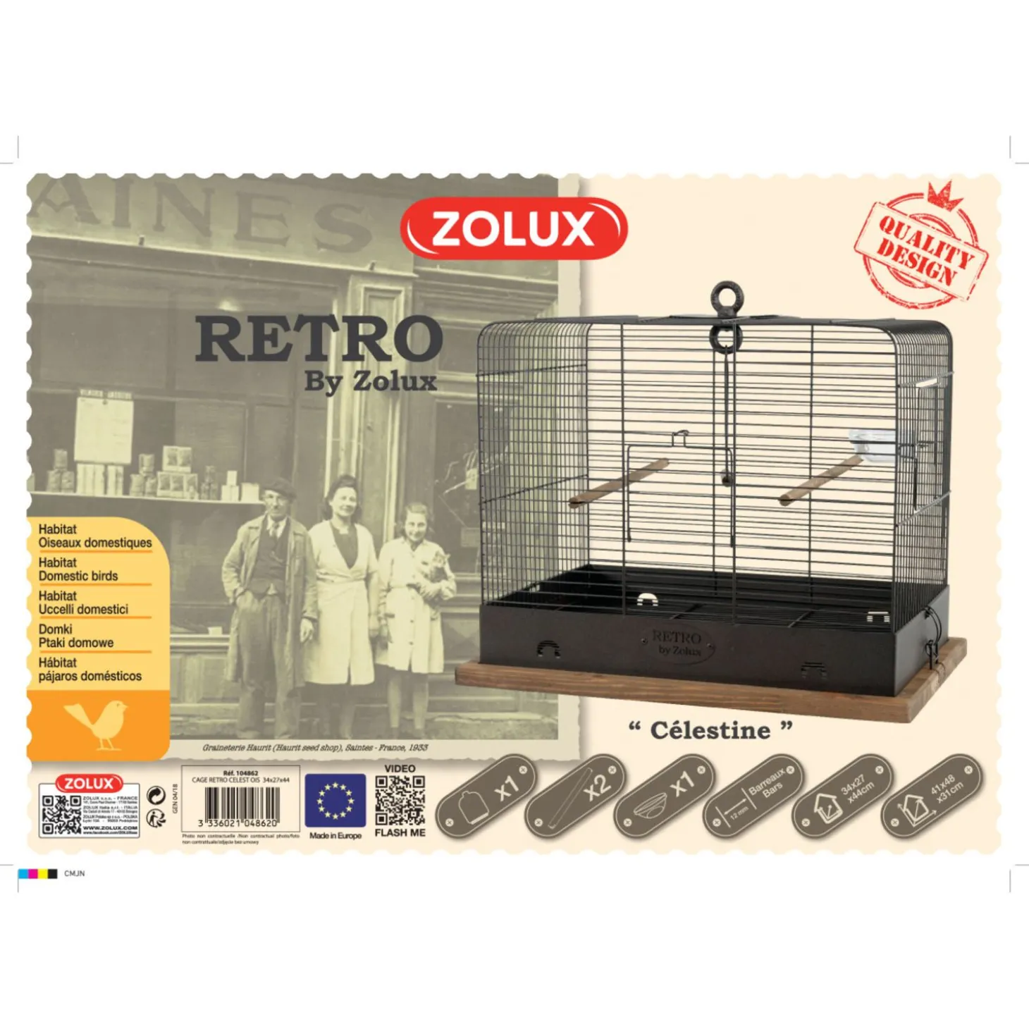 Deze rechthoekige vogelkooi bevat een houten bodem met daar bovenop een stevig traliewerk. De bodem en de tralies zijn van elkaar los te koppelen zodat je de kooi eenvoudig kunt schoonmaken. Bovenop bevindt zich een haakje waaraan je de kooi kunt ophangen, dit is echter niet aan te raden omdat vogels dit eng kunnen vinden. Zet de kooi in plaats daarvan neer op een tafel of kast, of op het bijpassende Retro Standaard Celestine van Zolux (NIET inbegrepen, los te koop).
