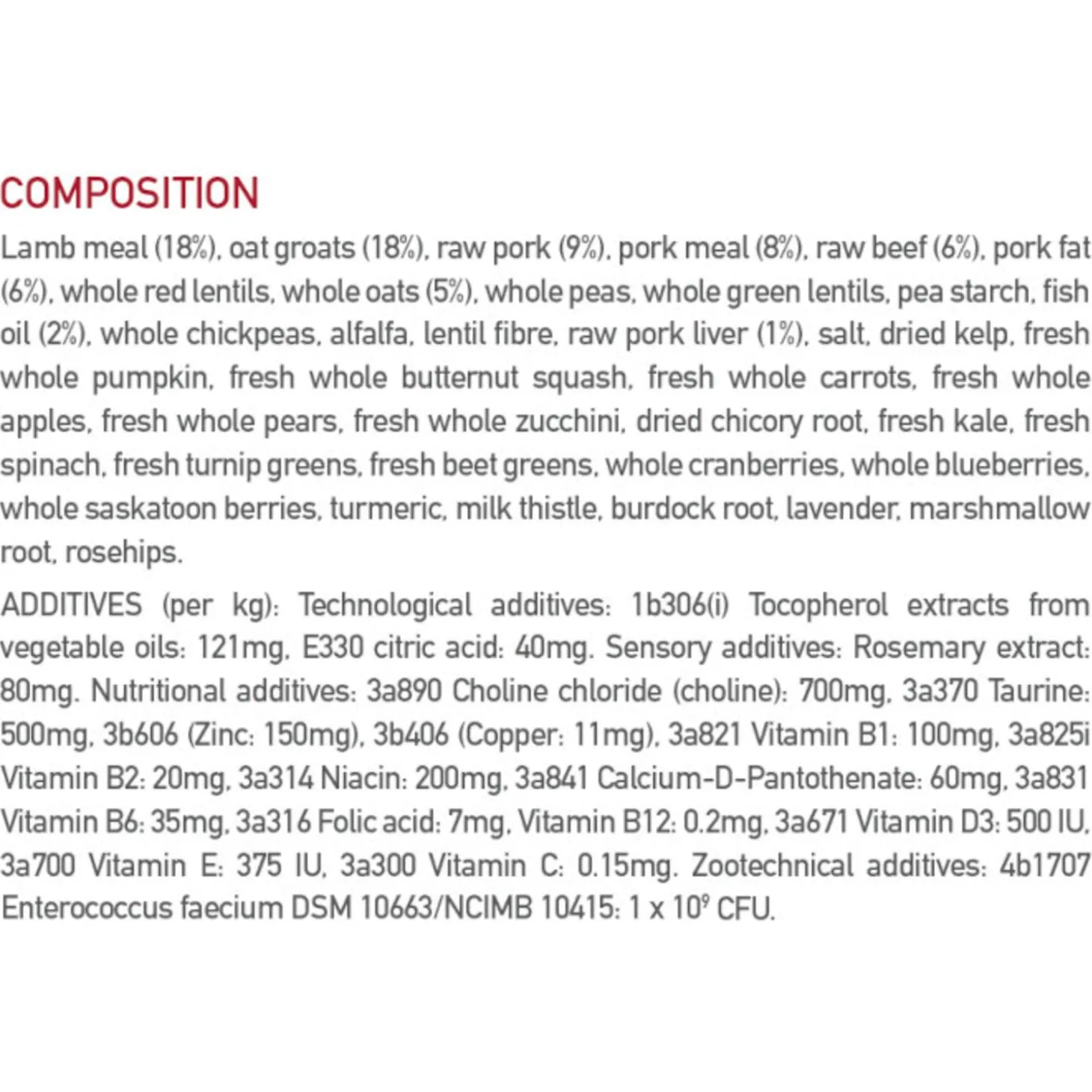 | Samenstelling | Lamsvleesmeel (23%), Gesneden haver (22%), Verse Angus rundvlees (5%),Vers Yorkshire varken (5%), Lams vet (5%), Hele rode linzen, Hele groenenerwten, Hele groenen linzen, Vers gras gevoerd lam (4%), Hele haver,Verse runderlever (2%), Varkensvlees meel (2%), Haring olie (2%), Versevarkenslever (2%), Hele garbanzo bonen, Hele gele erwten, Zon gedroogdealfalfa, Linzen vezel, vers rundvlees pens (1%), Gedroogde bruine zeewier,Verse pompoen, Verse butternut squash, Verse pastinaak, Verse groeneboerenkool, Verse spinazie, Verse wortelen, Verse Red Delicious appels,Verse Bartlett peren, Gevriesdroogde rund lever (0.1%), Verse cranberries,Verse bosbessen, Cichoreiwortel, Kurkuma, Mariadistel, kliswortel,Lavendel, heemstwortel, rozenbottels. |