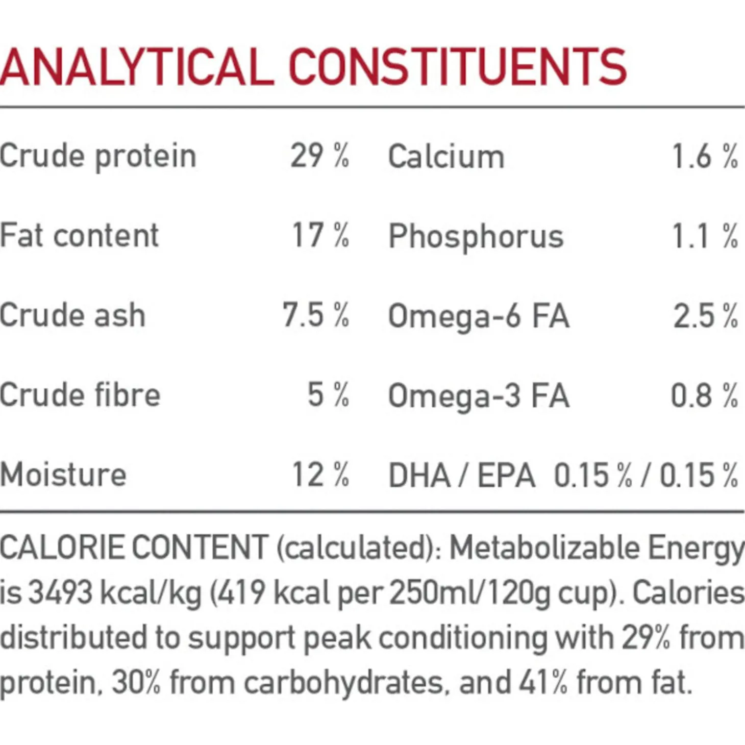| Analyse | Ruw eiwit 29 %Ruw vet 17 %Ruwe as 7.5 %Ruwe celstof 5 %Vocht 12 %Calcium 1.5 %Fosfor 1.1 %Omega-6 vetzuren 2.5 %Omega-3 vetzuren 0.8 %DHA / EPA 0.15 % / 0.15 %Glucosamine 600 mg/kgChondroitine 800 mg/kg |