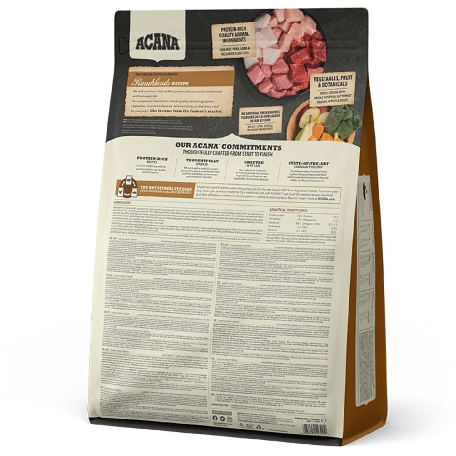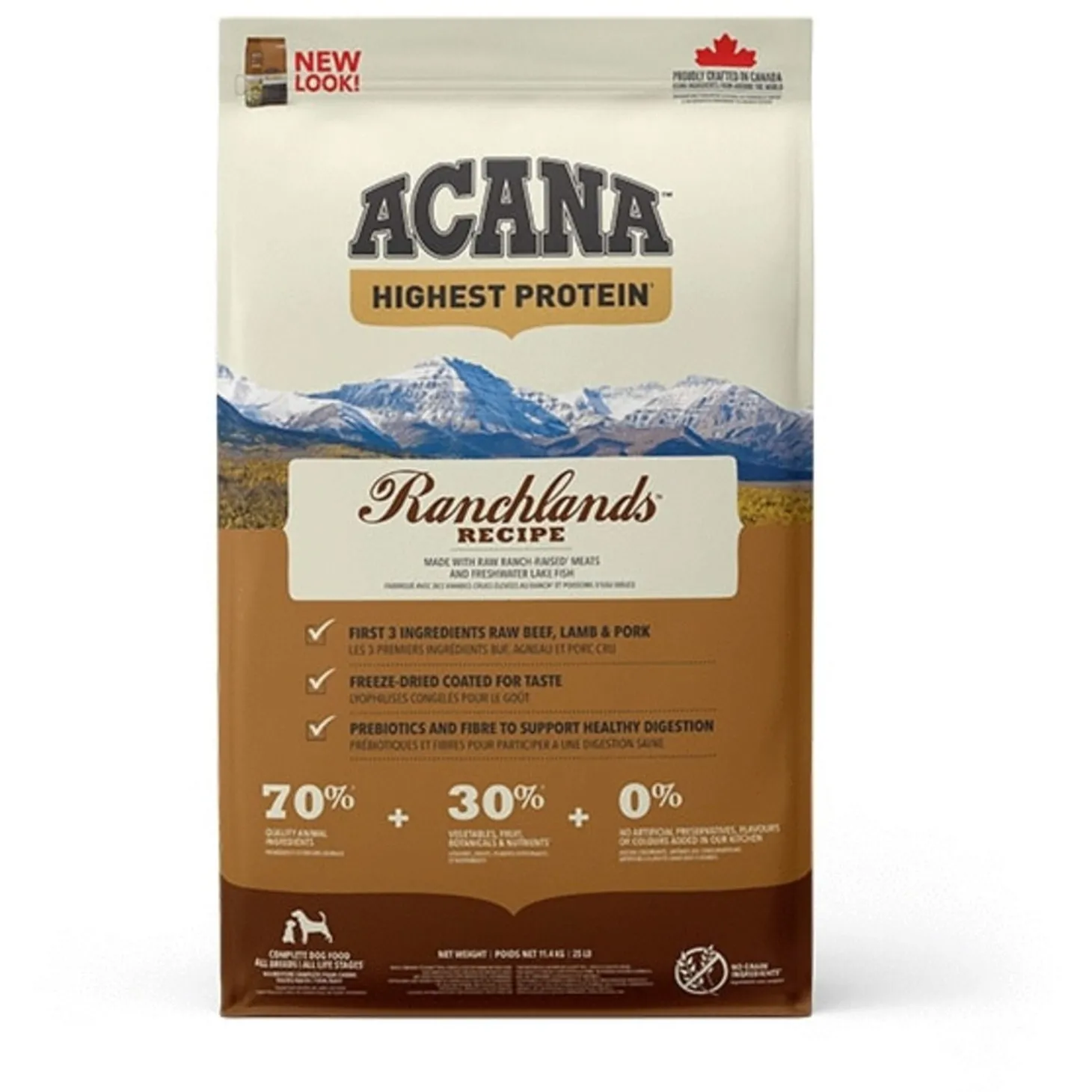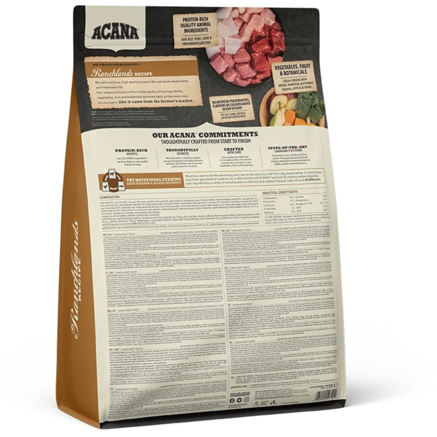 Acana Regionals Ranchlands is een hoogwaardige, eiwitrijke voeding voor volwassen honden van alle rassen en maten. Het recept is samengesteld met 70% dierlijke ingrediënten van hoge kwaliteit, waaronder vers of rauw rund-, lams- en varkensvlees, zoetwatervis en bizon. Dit zorgt voor een optimale eiwitopname en een gezonde spieropbouw.