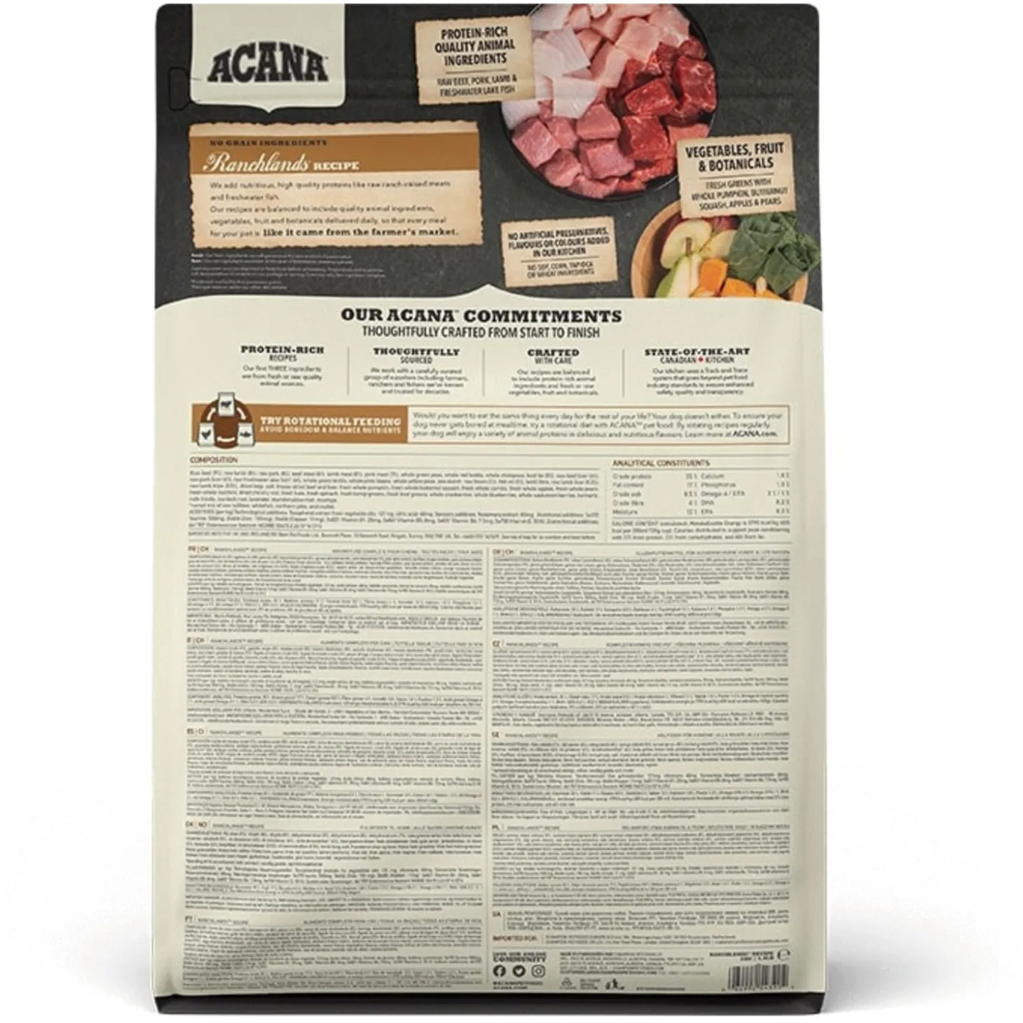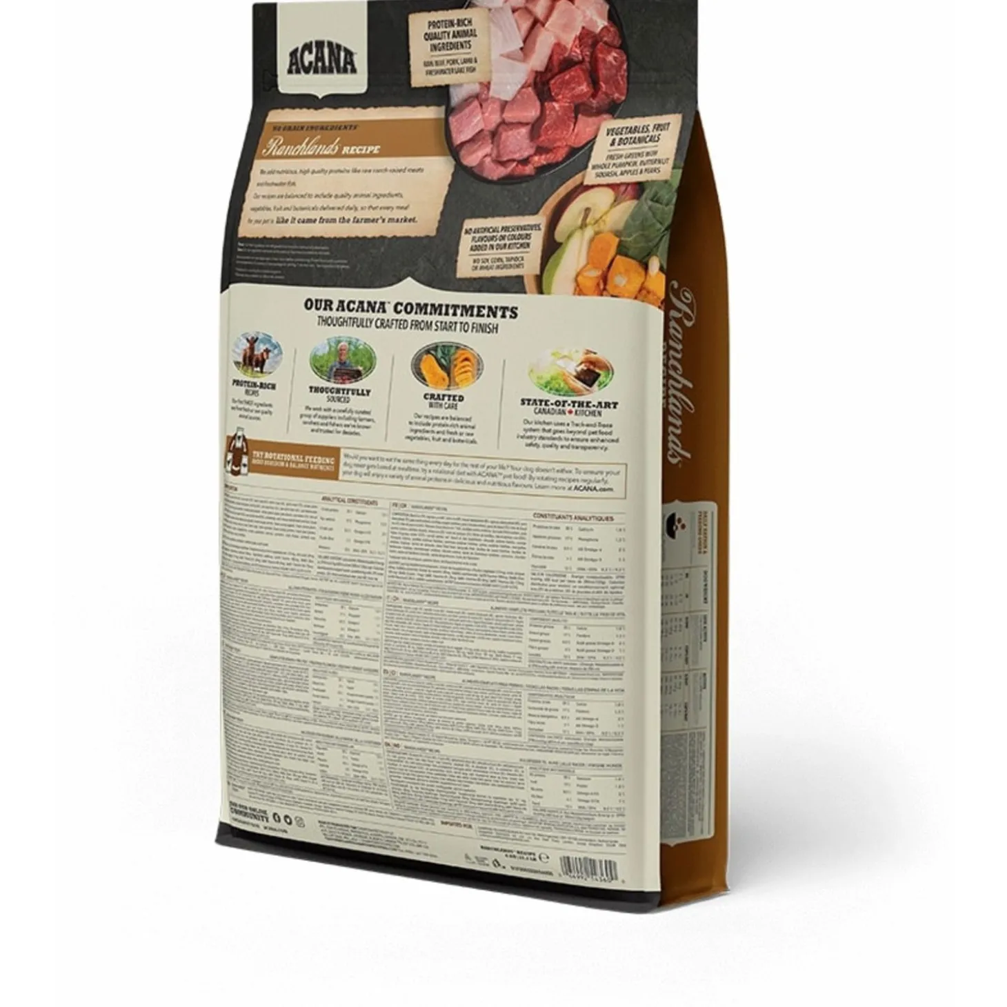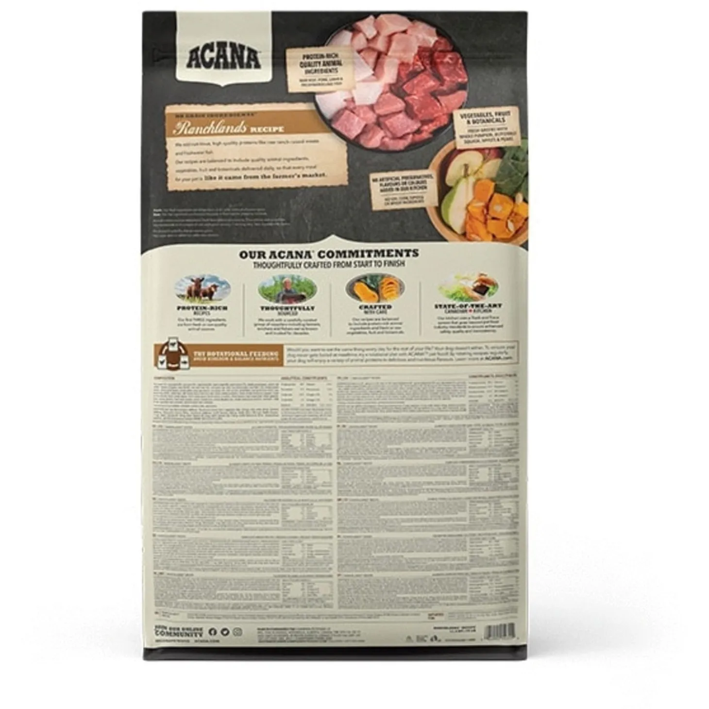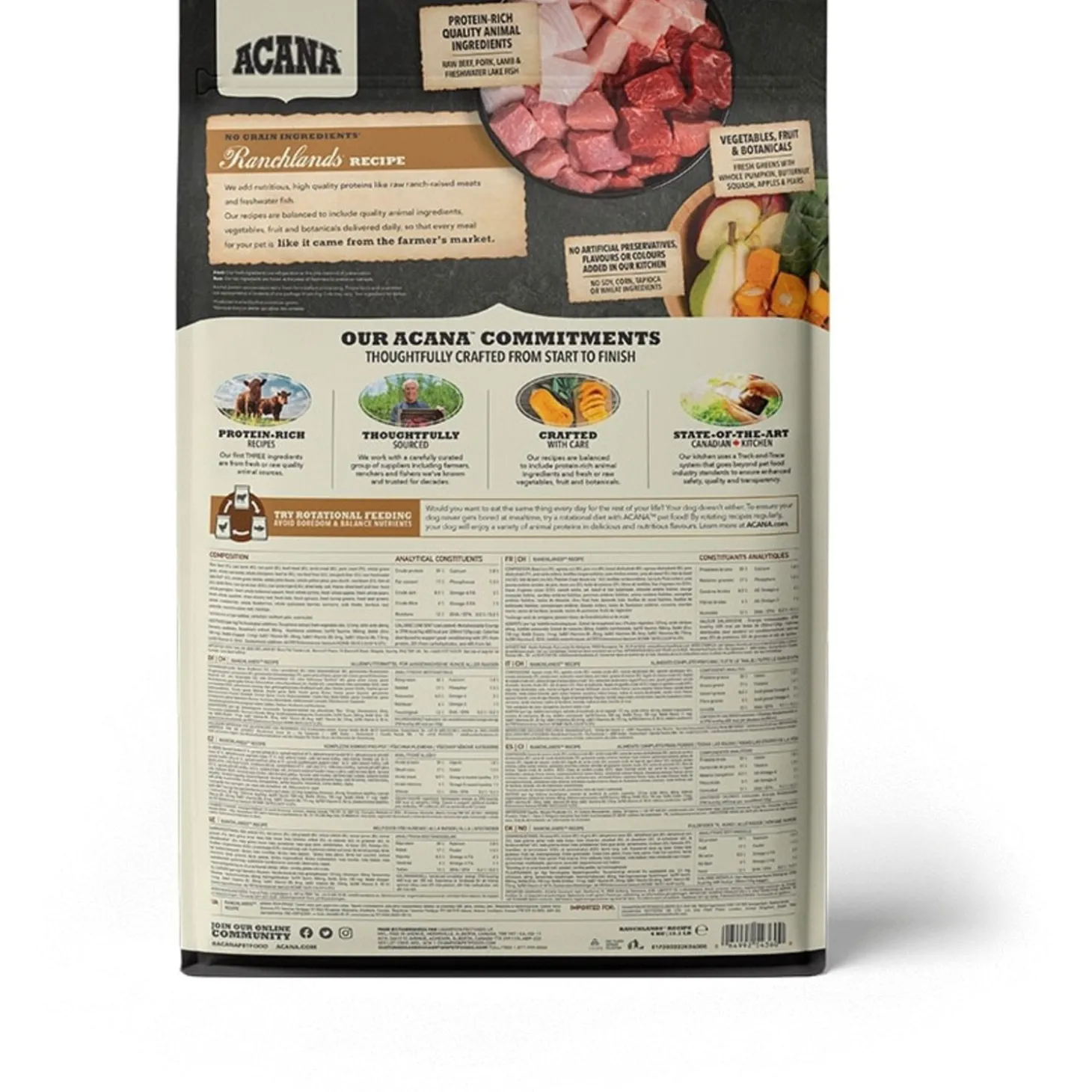 Acana Regionals Ranchlands is een hoogwaardige, eiwitrijke voeding voor volwassen honden van alle rassen en maten. Het recept is samengesteld met 70% dierlijke ingrediënten van hoge kwaliteit, waaronder vers of rauw rund-, lams- en varkensvlees, zoetwatervis en bizon. Dit zorgt voor een optimale eiwitopname en een gezonde spieropbouw.