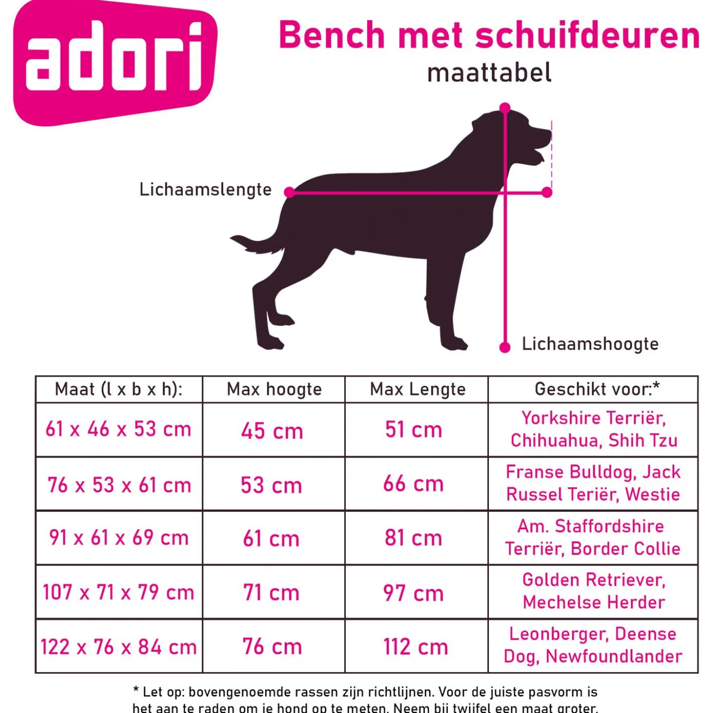 De Bench met Schuifdeuren van Adori is een zwarte bench voor je viervoeter, uniek aan deze bench zijn de schuifdeuren aan de voor- en zijkant. Een bench neemt namelijk al aardig wat ruimte in beslag en soms kan hij nét niet staan op de plek die je voor ogen hebt door die vervelende deurtjes. Of misschien is de ruimte wat krap en stoot je je elke keer weer aan het openslaande deurtje.