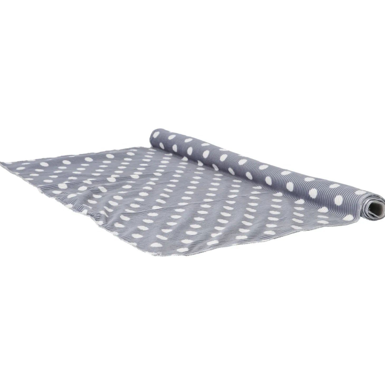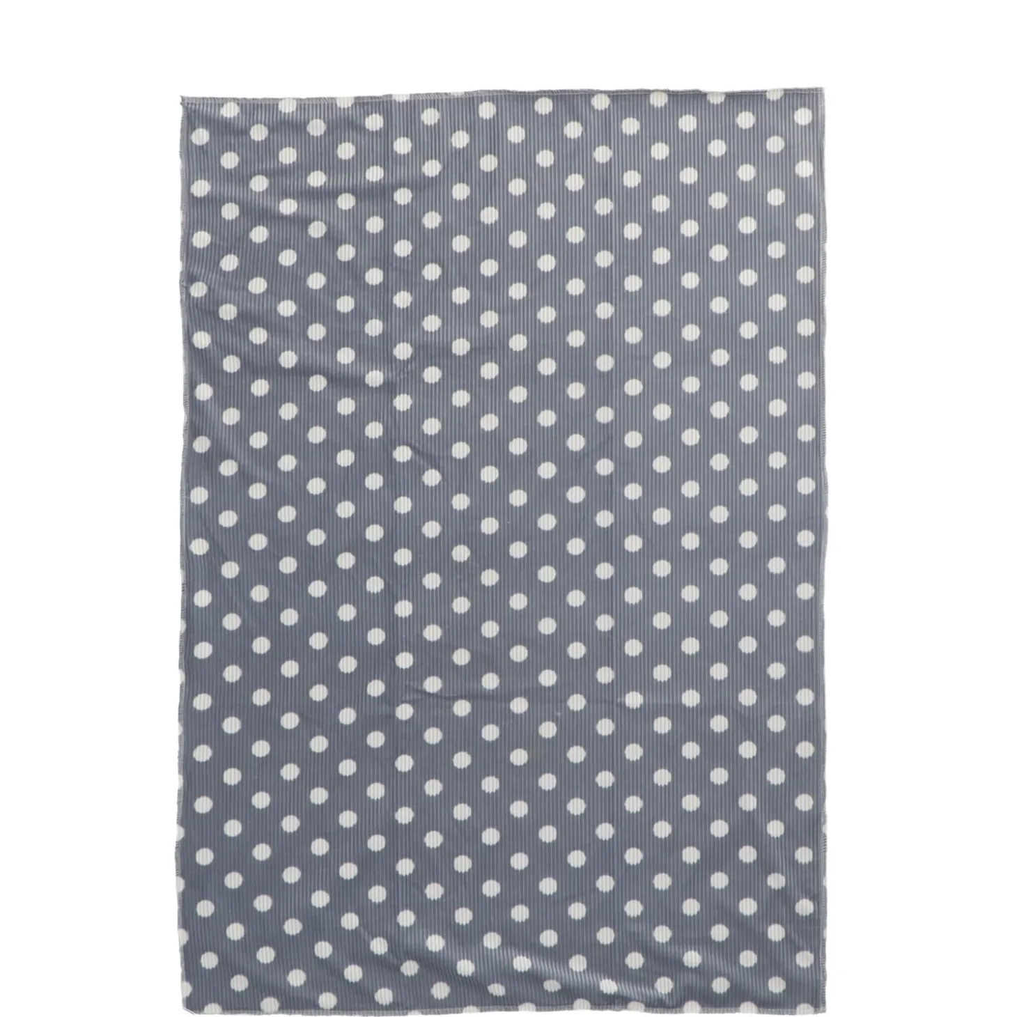 De Dotty heeft twee kanten, een geribbelde, blauwe bovenzijde met stippen en een effen grijze onderkant. Het kleedje is geschikt voor op de bank, in de vensterbank of in de bench. De Dotty is een dun dekentje, ideaal voor het warmere weer.