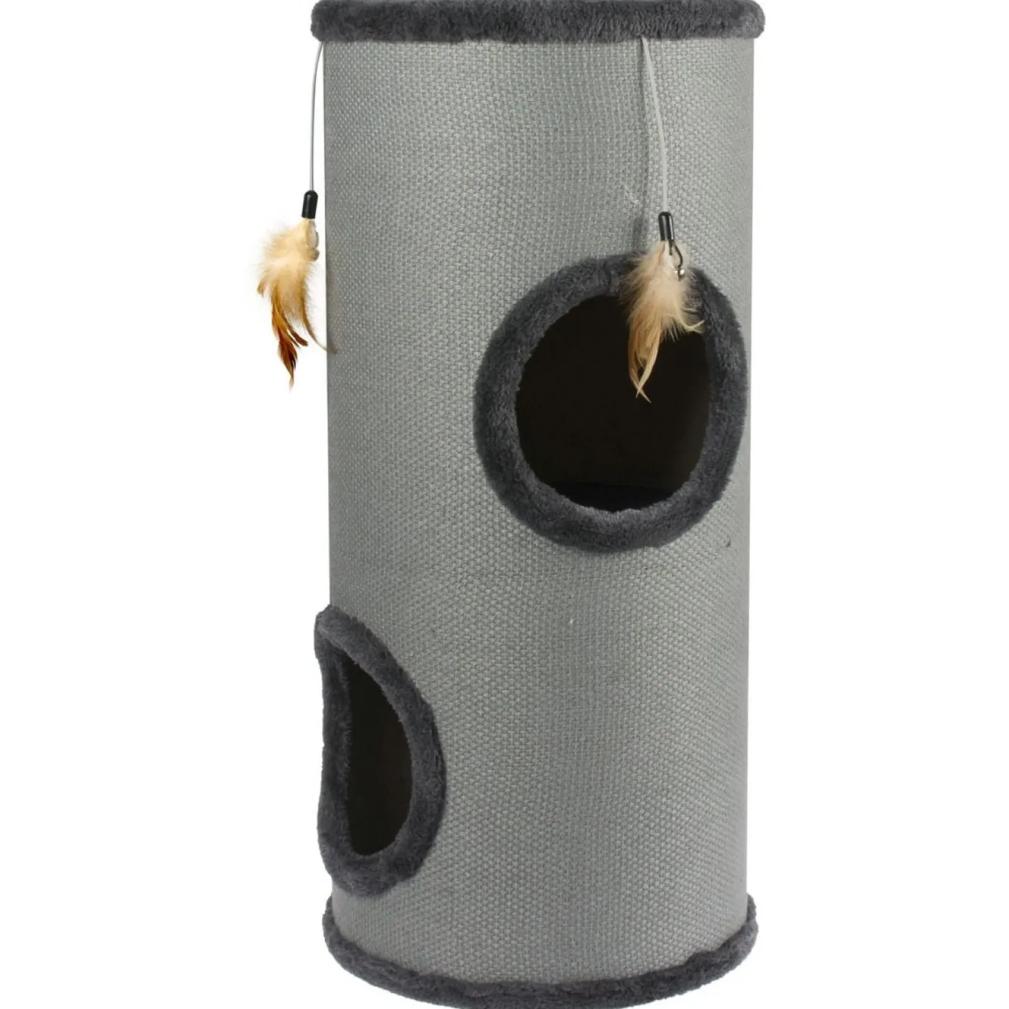 De Krabton Sheila van Adori heeft een afmeting van 32,5 x 70 cm en is een strakke toevoeging aan je interieur. Deze krabton bevat drie openingen waar je kat in kan kruipen, twee aan de zijkanten en eentje aan de bovenkant. Binnenin kan je kat heerlijk slapen of lekker ravotten. De buitenkant van de krabton is bekleed met sisaltouw om aan te krabben. Aan de bovenkant zijn nog twee speeltjes met veren en belletjes bevestigd om voor nog meer fun te zorgen. Zo biedt deze krabton oneindig veel krabplezier voor je kat! De Sheila krabton is grijs van kleur.