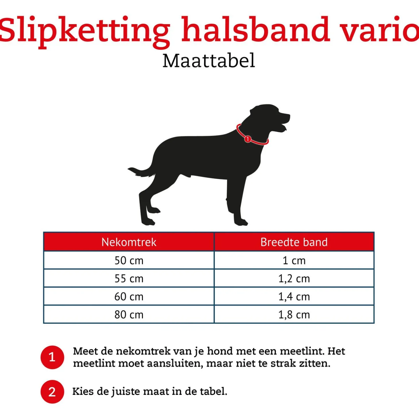 De Slipketting Halsband Vario is donkerbruin van kleur en komt voor in vier verschillende maten. Door de halsomvang van je hond te meten, kan je de juiste maat bepalen.