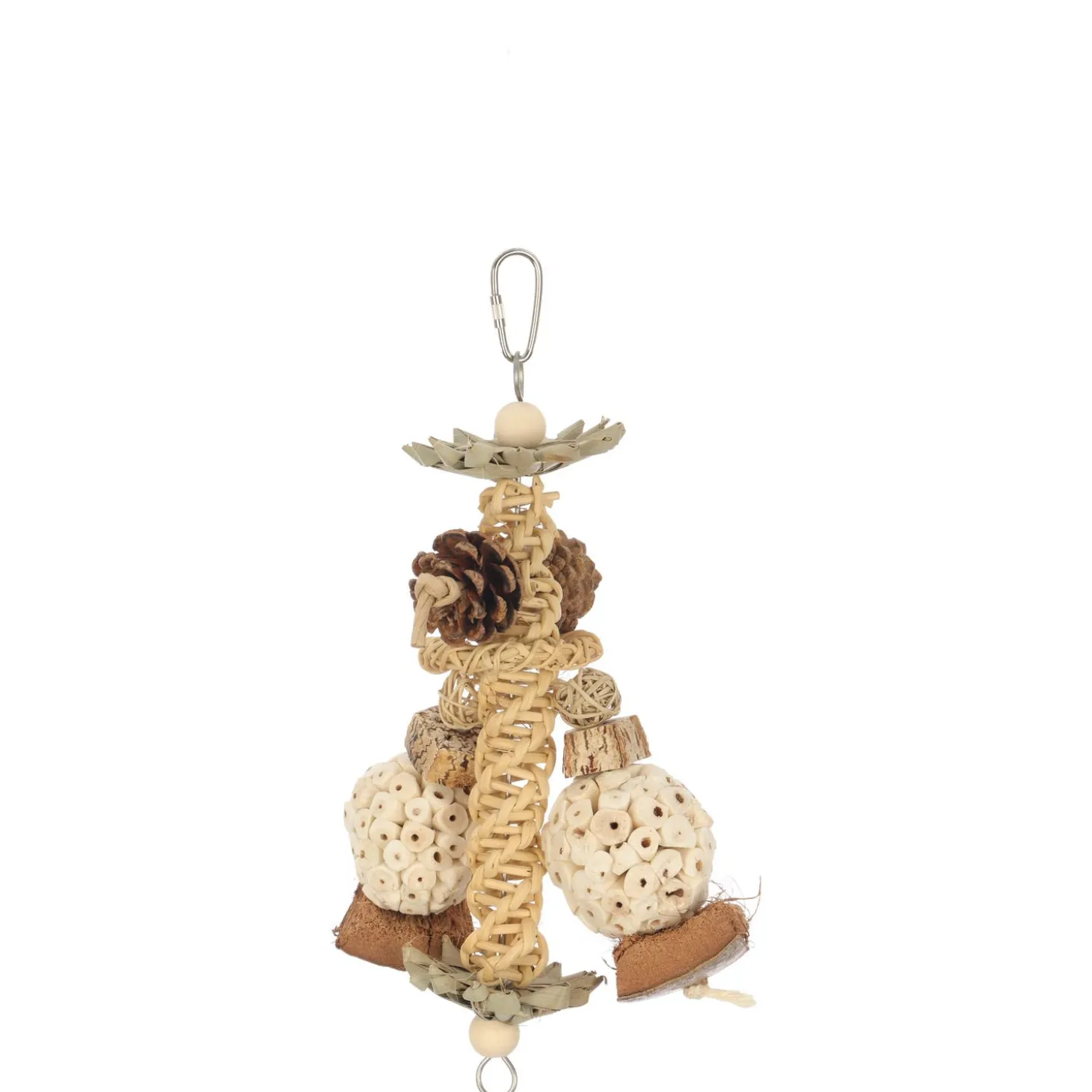 De Adori Twist n Sola is een zorgvuldig samengesteld vogelspeeltje dat perfect aansluit bij het natuurlijke foerageer- en sloopgedrag van je vogel. Het speelgoed heeft een unieke gevlochten middenas waaraan verschillende natuurlijke elementen zijn bevestigd, zoals sola ballen, dennenappels, houten kralen en bladeren. Deze diversiteit aan materialen biedt je vogel een complete speelervaring – van klimmen langs de centrale as tot knabbelen aan de verschillende onderdelen. De natuurlijke materialen zijn niet alleen veilig voor je vogel, maar stimuleren ook het instinctieve gedrag om te knagen, te slopen en te onderzoeken. Het speeltje is gemakkelijk op te hangen met de metalen karabijnhaak, zodat je vogel er direct mee aan de slag kan.