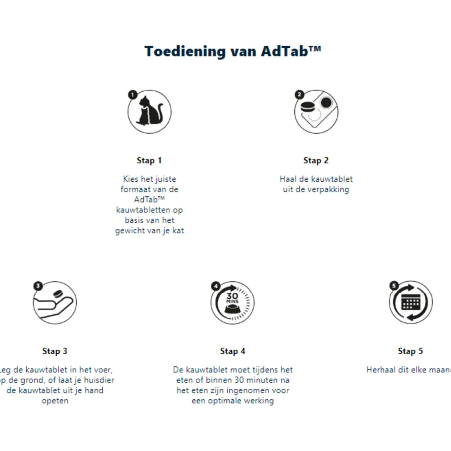 Geef je kat één keer per 30 dagen één kauwtablet bij het eten of binnen 30 minuten na het eten. Kies het juiste formaat AdTabTM op basis van het gewicht van je kat.