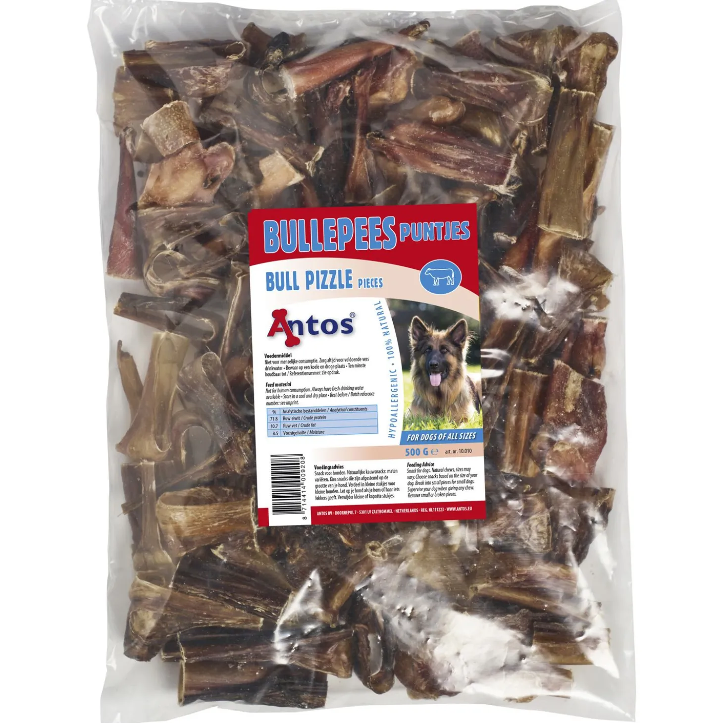 De bullepeespuntjes van Anthos, klein gemaakte bullepees, je hebt er vast wel eens van gehoord? Een heerlijke harde kauwsnack waar honden wel even zoet mee zijn. De bullenpees ruikt lekker en heeft een vlezige smaak. Naarmate de hond er langer op kauwt wordt het gedeelte wat zachter om af te bijten. Bullenpezen worden op een lage temperatuur gedroogd en hierdoor blijven alle vitaminen goed bewaard.