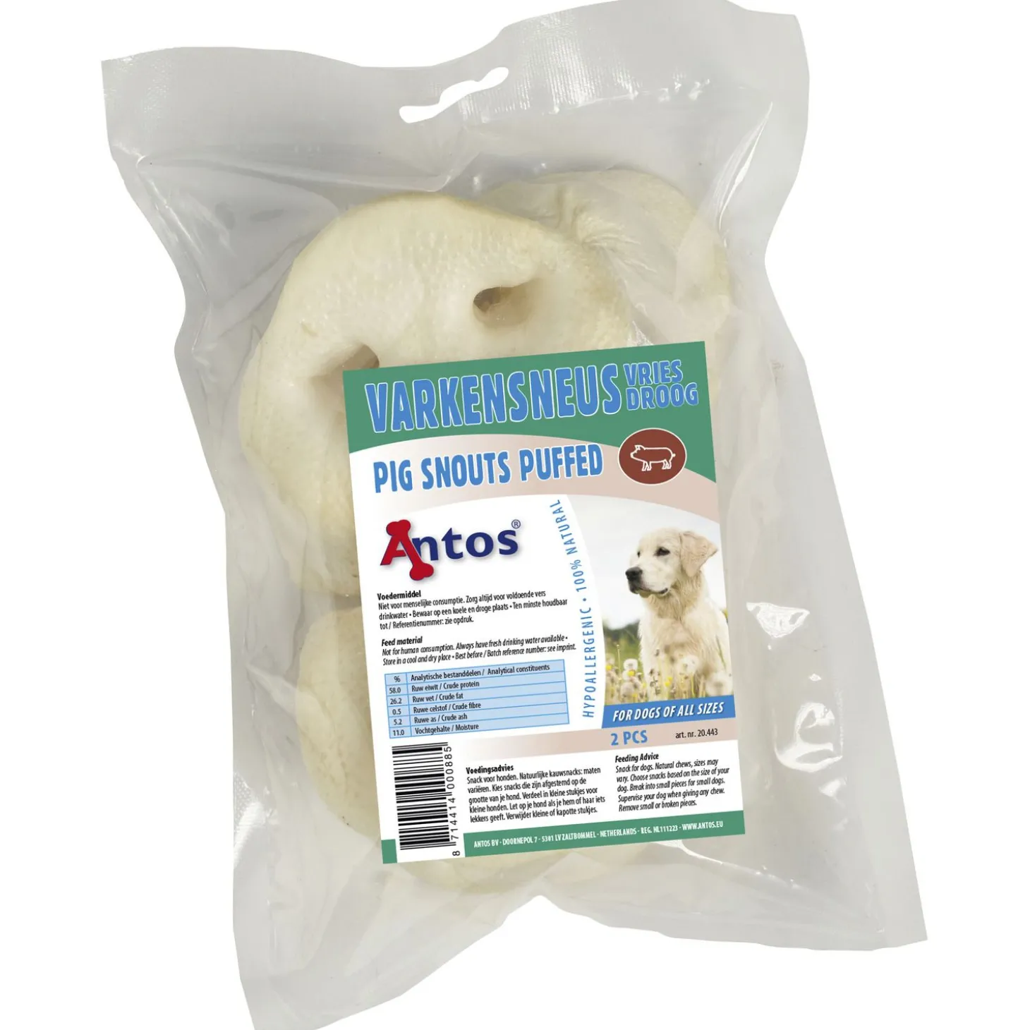 De Gepofte varkensneuzen van Antos zijn een geliefde kauwsnack voor je hond. De varkensneuzen zijn met zorg gepoft (gedroogd) en volledig ontvet. De neuzen zijn vet- en geurarm, dus niet alleen voor je hond een plezier maar ook voor jou als baasje!