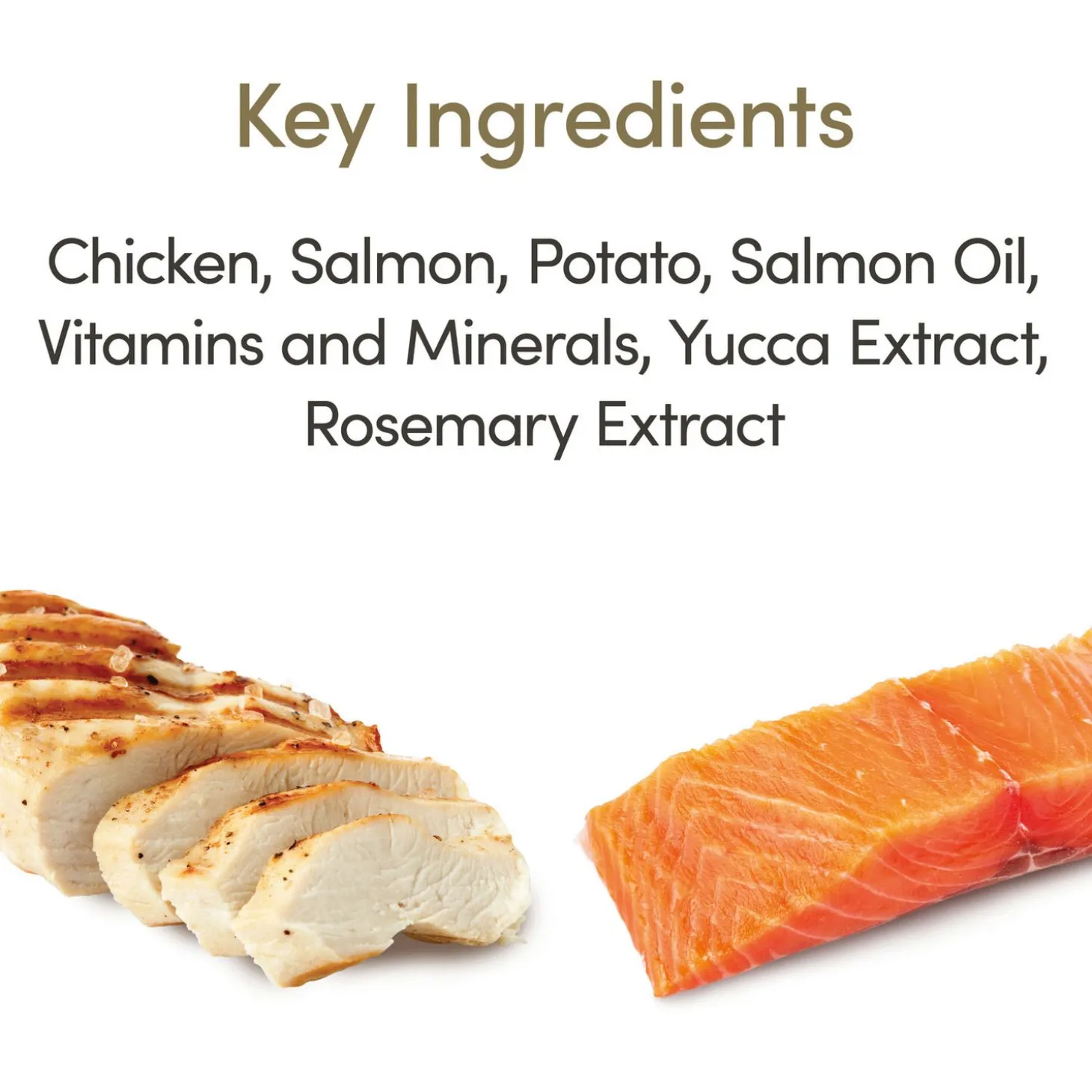 Gedroogde Kip (50%), gedroogde Zalm (13%) kippen gehakt (13%), aardappel , zalm 6 % , bietenpulp , biergist , zalm olie (1% bron van Omega 3) , kippen boullion (1 %), vissen boullion (0,5%), vitaminen en mineralen, gedroogd ei, Cellulose vezel (0,03 %) natriumchloride , calciumcarbonaat , zeewier / kelp , bosbessen, DL- methionine, kaliumchloride, Yucca Extract, Citrus Extract , Rosemary Extract