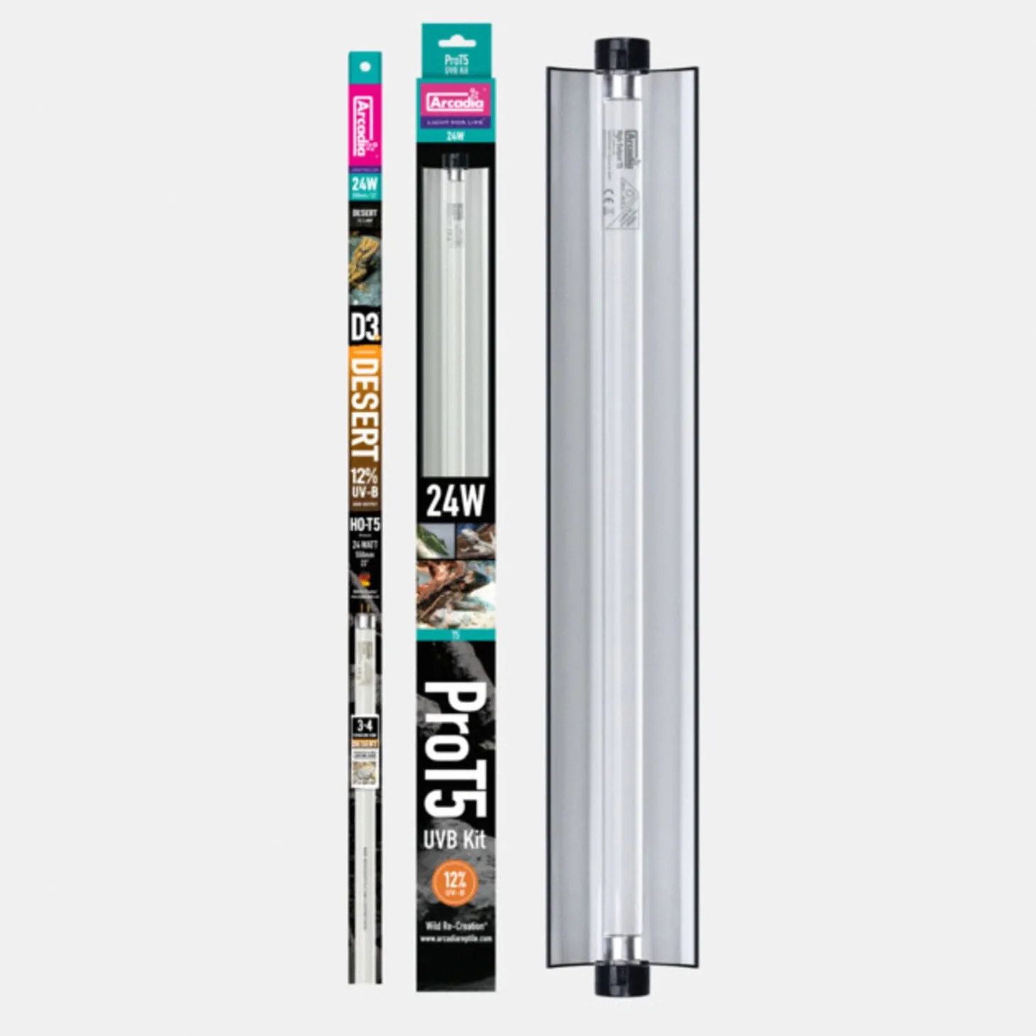 - Bevat armatuur, reflector en 12% T5 UVB 24watt lamp. Deze lampen geven 12 maanden stabiele UV opbrengst over een veel bredere zone dan de spotlampen.