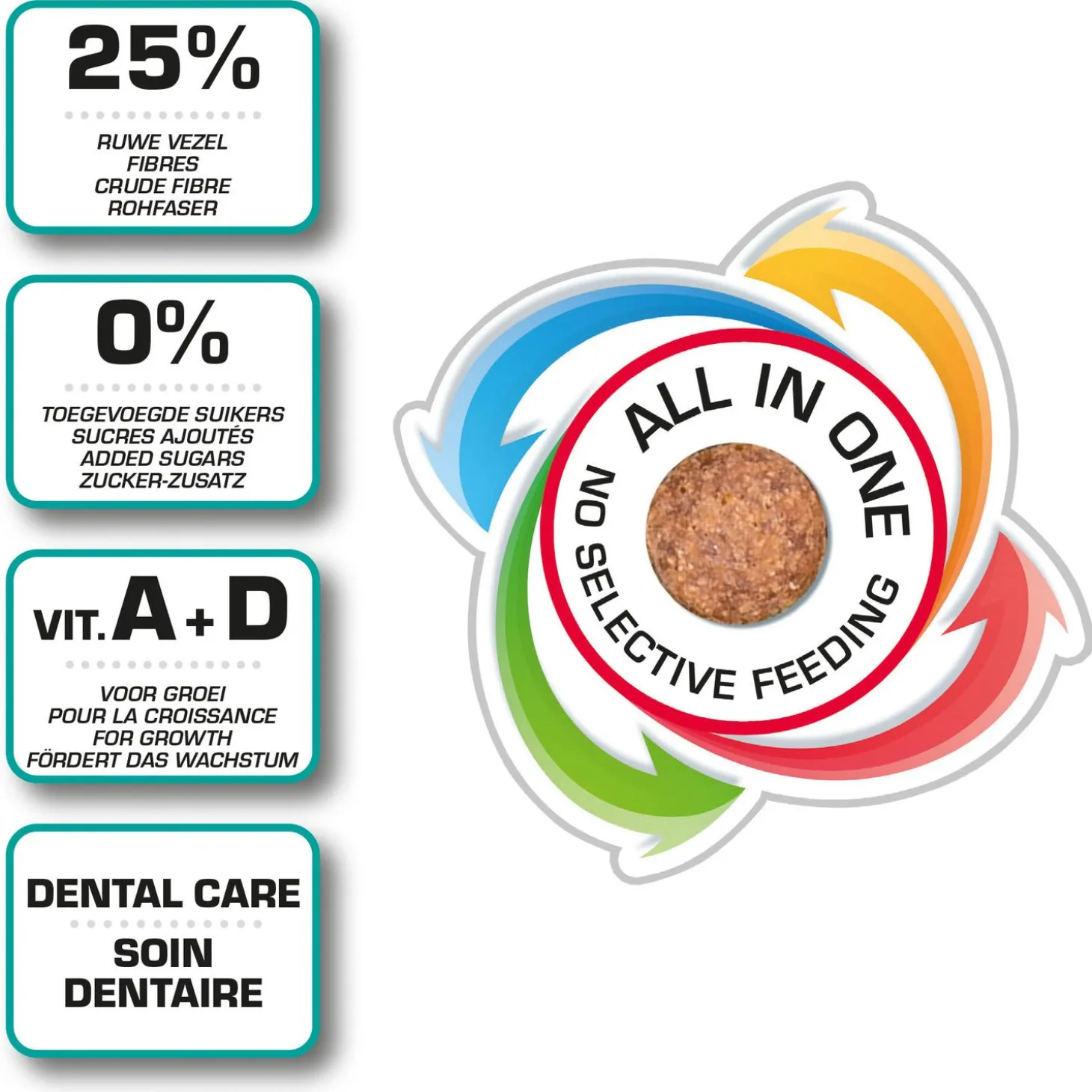 Het voer heeft een hoog vezelgehalte (25%) voor een goede gezondheid en een optimale spijsvertering en extra calium en vitamine A en D3 voor de juiste ontwikkeling van botten en gebit. Voordat je overschakelt naar deze voeding is het belangrijk om geleidelijk aan over te schakelen van het ene naar het andere voer. Mix daarom gedurende de eerste dagen het oude voer met Care+ . De dagelijkse hoeveelheid Care+ is afhankelijk van gewicht, conditie en mate van activiteit.