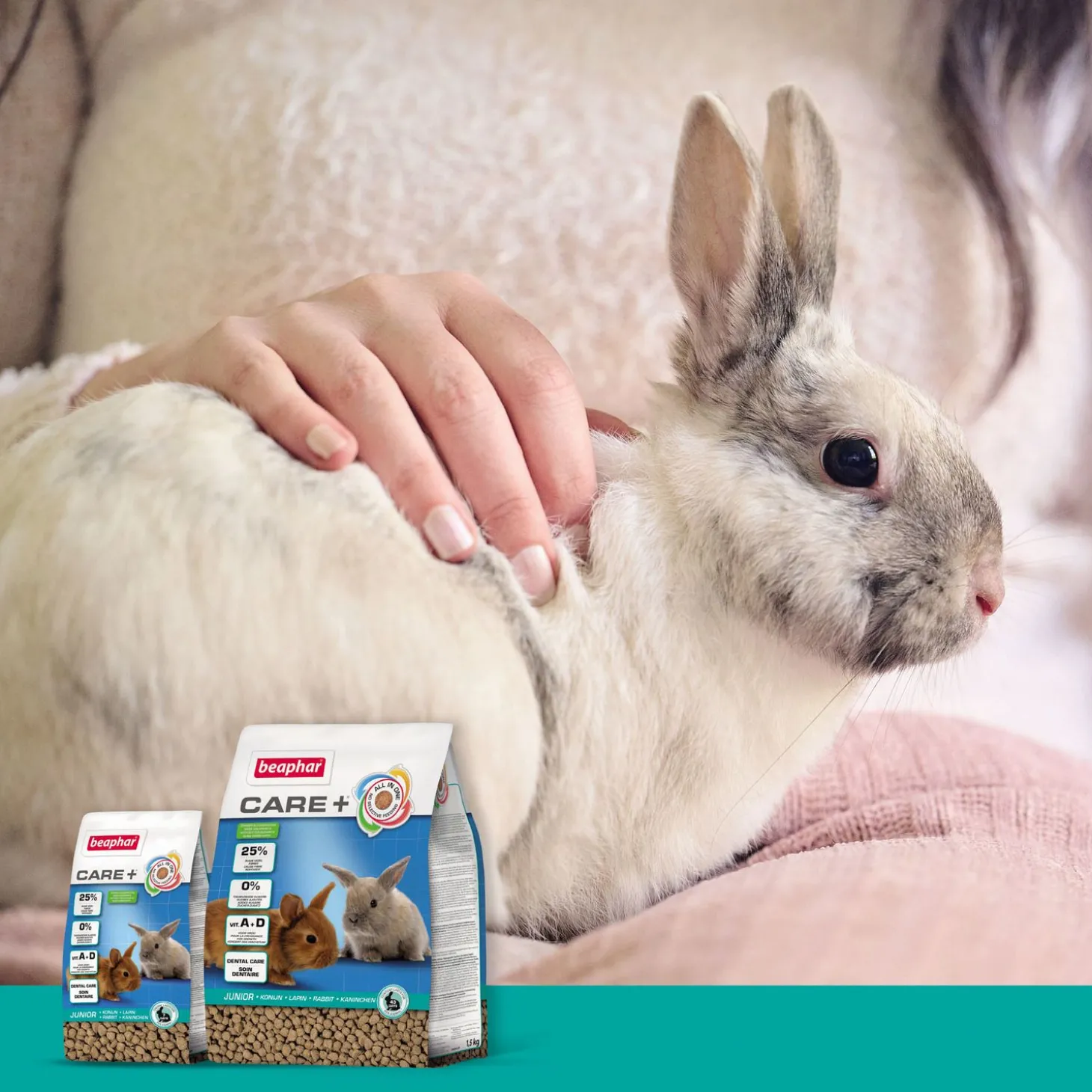 Beaphar Care+ Konijn Junior is verkrijgbaar 250 gram, 1,5 kg en 10 kg.