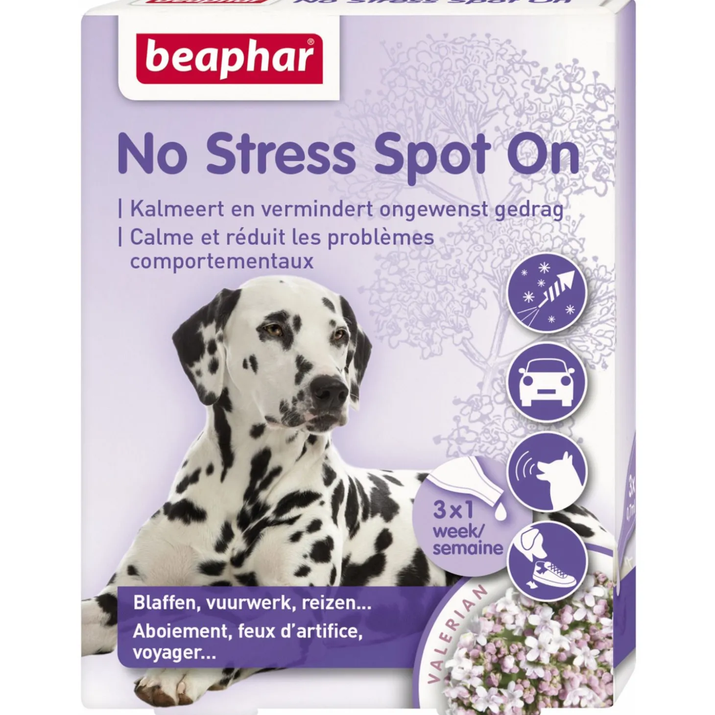 Veel honden kunnen stress ervaren bij harde knallen of andere harde geluiden tijdens onweer of de jaarwisseling. Ook een dierenarts bezoek, verhuizen of reizen kan voor stress zorgen. Met de Beaphar No stress Spot On Pipetten kun je je hond helpen tot rust te komen. De werkzame stof in de pipet is valeriaan extract welke een rustgevend effect heeft.