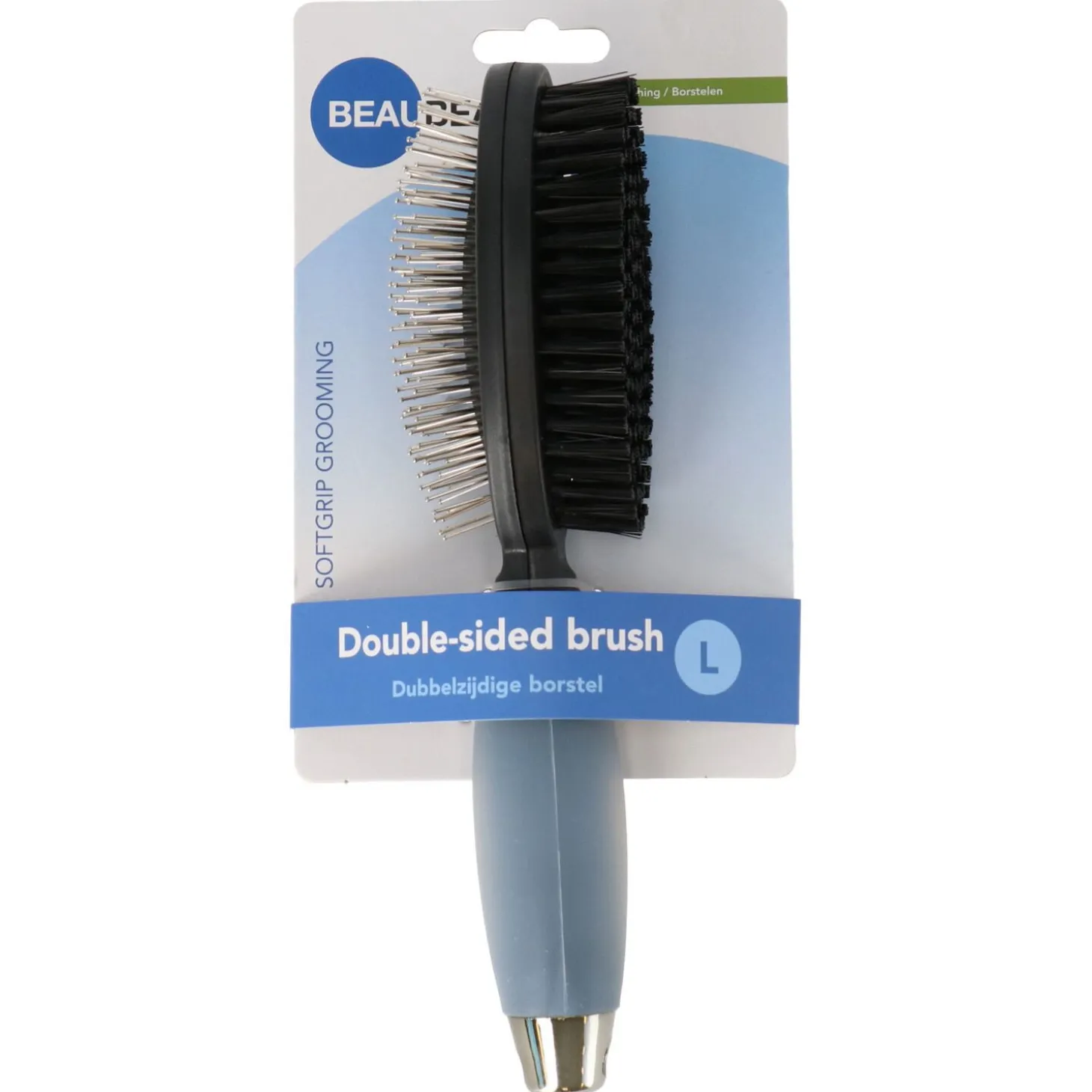 Deze praktische dubbelzijdige borstel biedt de complete oplossing voor dagelijkse vachtverzorging. De pinzijde verwijdert losse haren en voorkomt klitten, terwijl de nylon borstelzijde de vacht glad maakt en laat glanzen. Het grotere L-formaat is speciaal ontworpen voor efficiënt borstelen van middelgrote tot grote honden, terwijl het ergonomische softgrip handvat zorgt voor optimaal comfort tijdens langere borstelsessies.