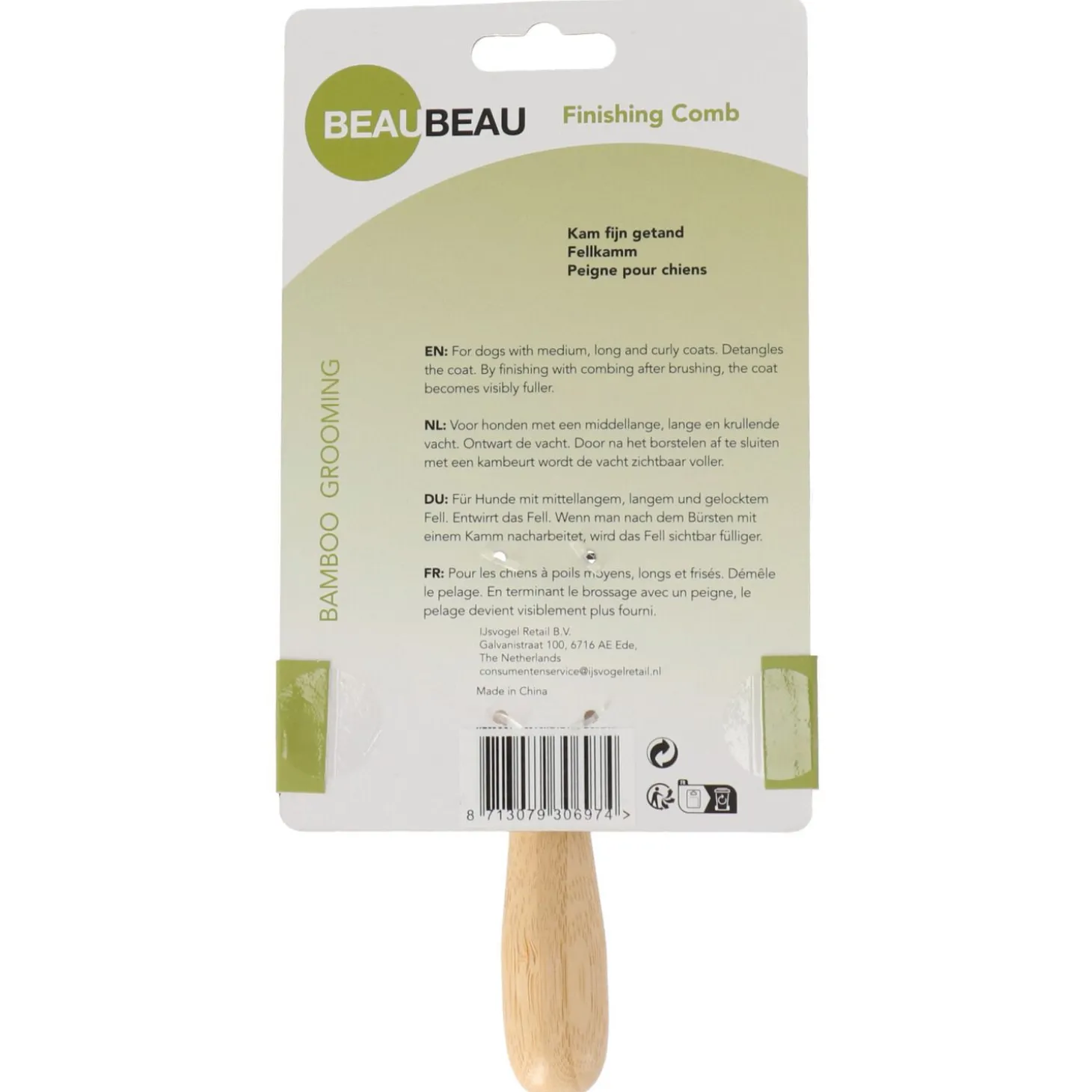 Deze veelzijdige kam combineert effectieve vachtverzorging met duurzaam materiaalgebruik. De fijne tanden zorgen voor een grondige reiniging en zijn perfect voor detailwerk bij gevoelige zones. Het ergonomische bamboe handvat maakt het kammen comfortabel, terwijl je met deze milieubewuste keuze bijdraagt aan een duurzame toekomst. Geef je hond de liefdevolle verzorging die hij verdient en bestel nu de BeauBeau Fijngetande Bamboe Kam!