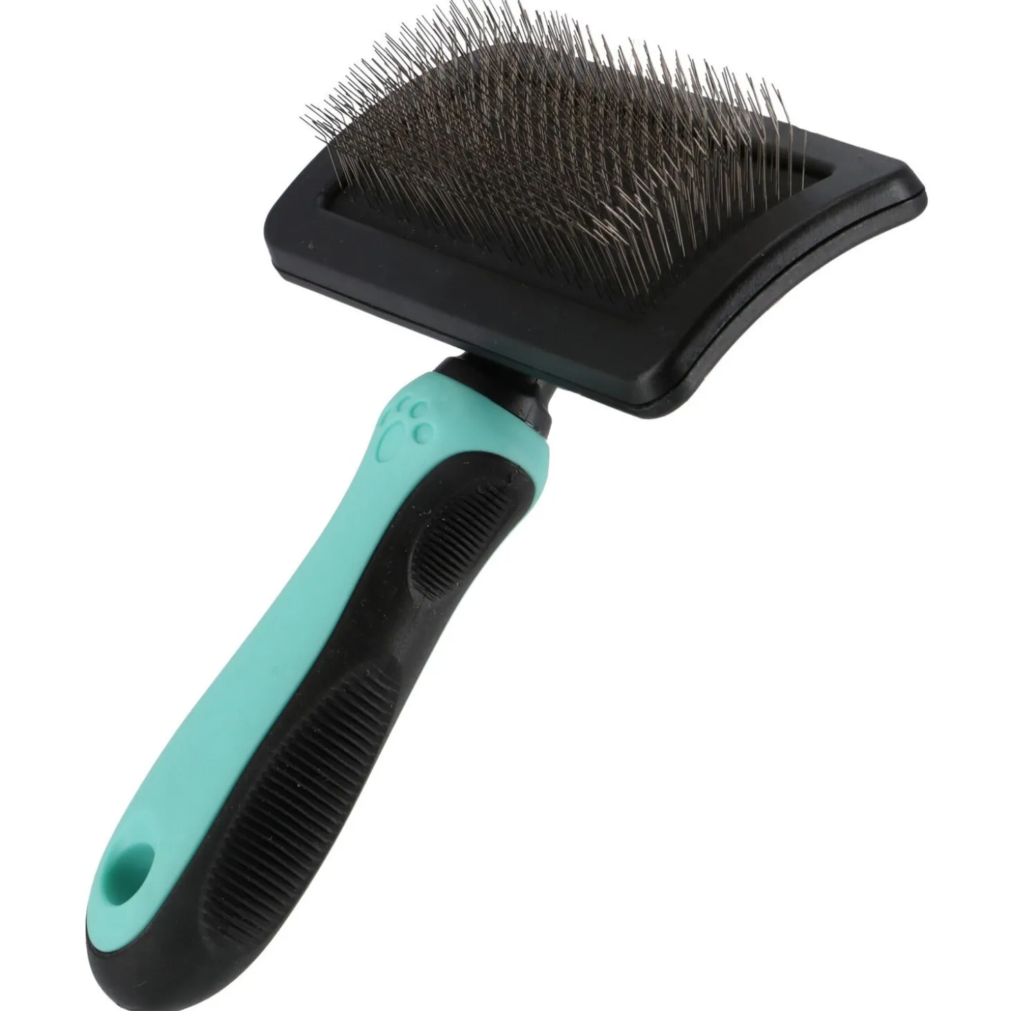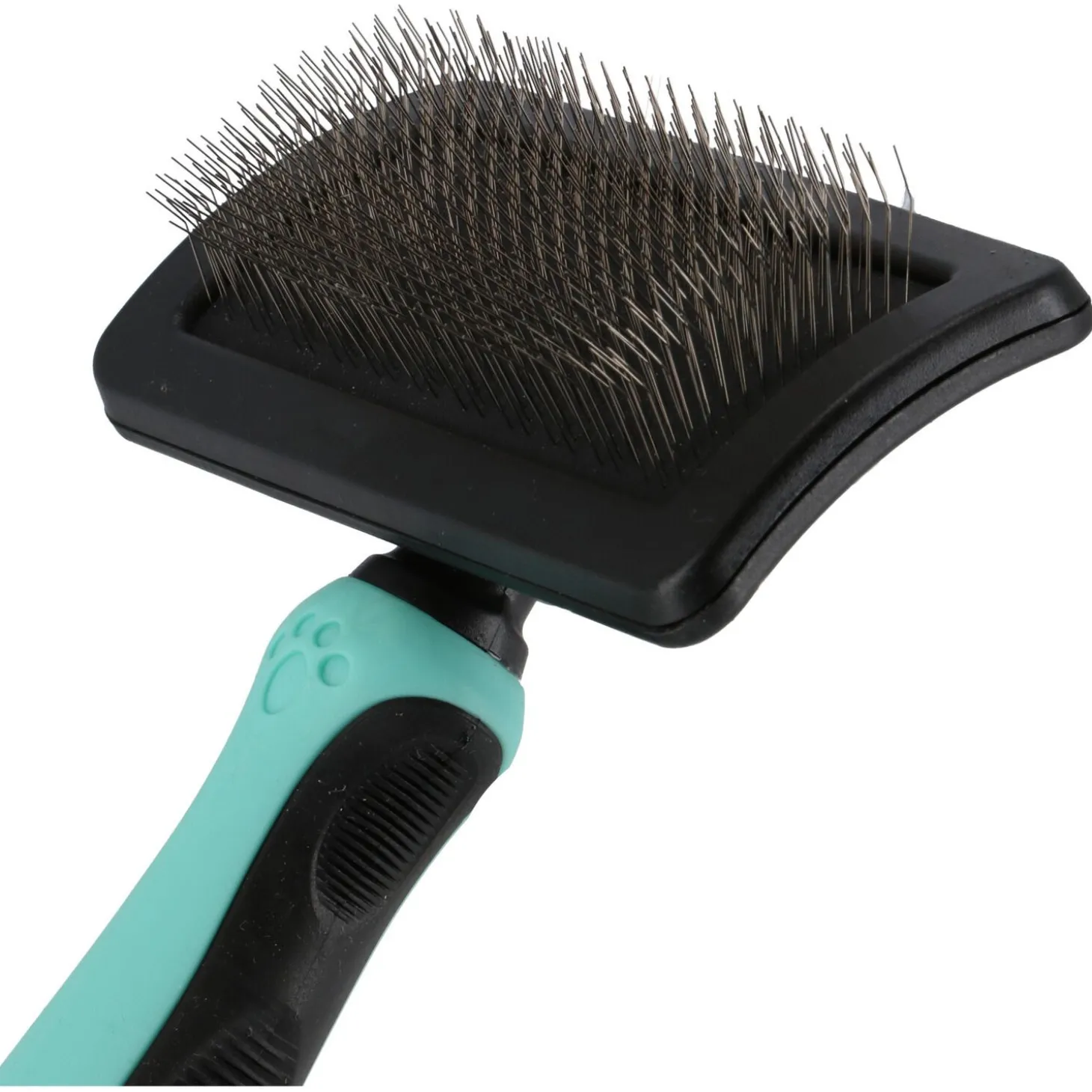 Deze specialistische slickerborstel met lange pinnen is de perfecte oplossing voor honden met een extra dikke, lange of krullende vacht. De extra lange, gebogen pinnen dringen dieper door dan een standaard slickerborstel, waardoor ze effectief klitten en overtollige onderwol verwijderen, zelfs bij de dichtste vachten. Het grote formaat maakt het mogelijk om grotere vachtoppervlakken snel en grondig te bewerken, wat een aanzienlijke tijdsbesparing oplevert. Het ergonomische handvat met turquoise softgrip verzekert een comfortabele grip en optimale controle, zelfs tijdens intensieve borstelsessies.