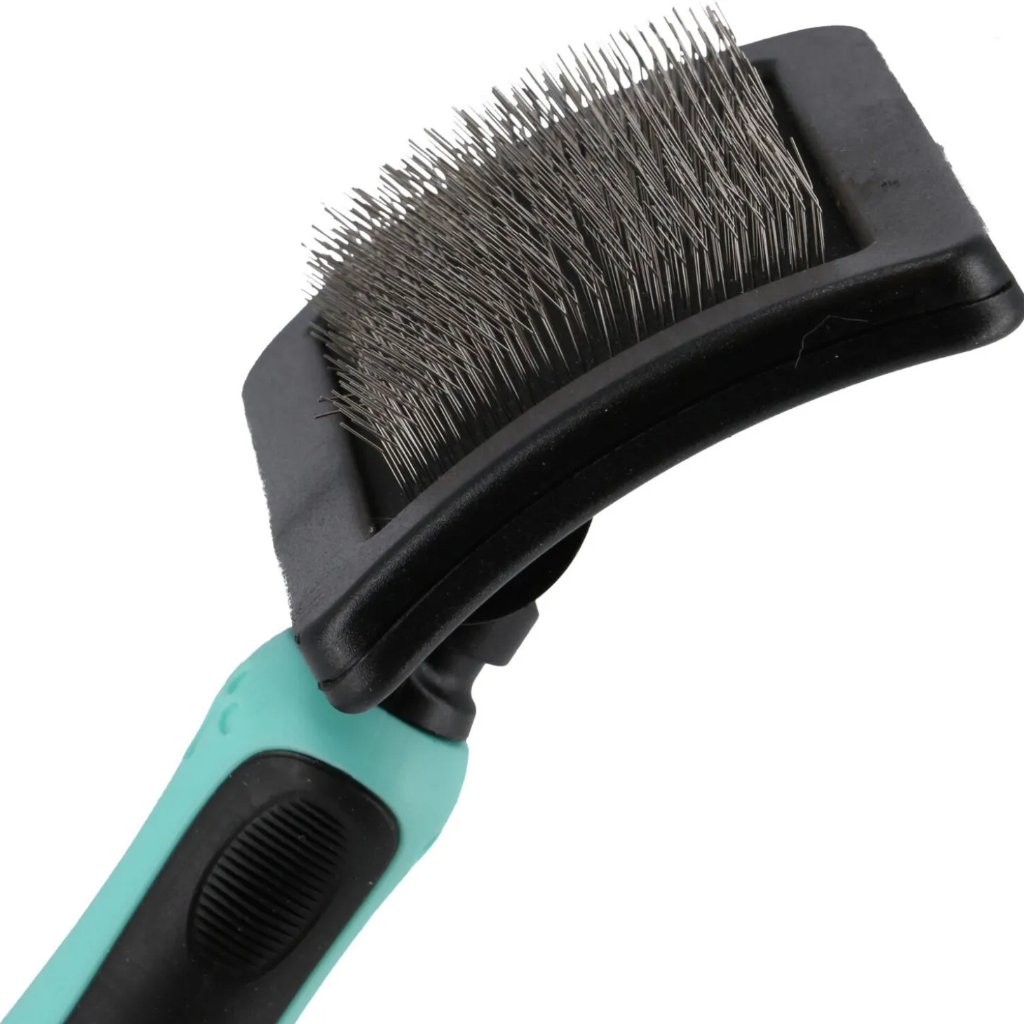 Deze extra grote slickerborstel is speciaal ontwikkeld voor eigenaren van grote en zeer grote hondenrassen met een volumineuze vacht. Het extra brede borstelvlak maakt het mogelijk om grote oppervlakken in korte tijd te behandelen, wat een aanzienlijke tijdsbesparing oplevert bij grote honden zoals Newfoundlanders, Berner Sennenhonden en Sint Bernards. De robuuste, gebogen pinnen dringen moeiteloos door tot diep in de ondervacht, waar ze effectief klitten ontwarren en overtollige onderwol verwijderen. Het duurzame, ergonomische handvat met turquoise softgrip biedt uitstekende controle en comfort, zelfs tijdens intensieve borstelsessies.