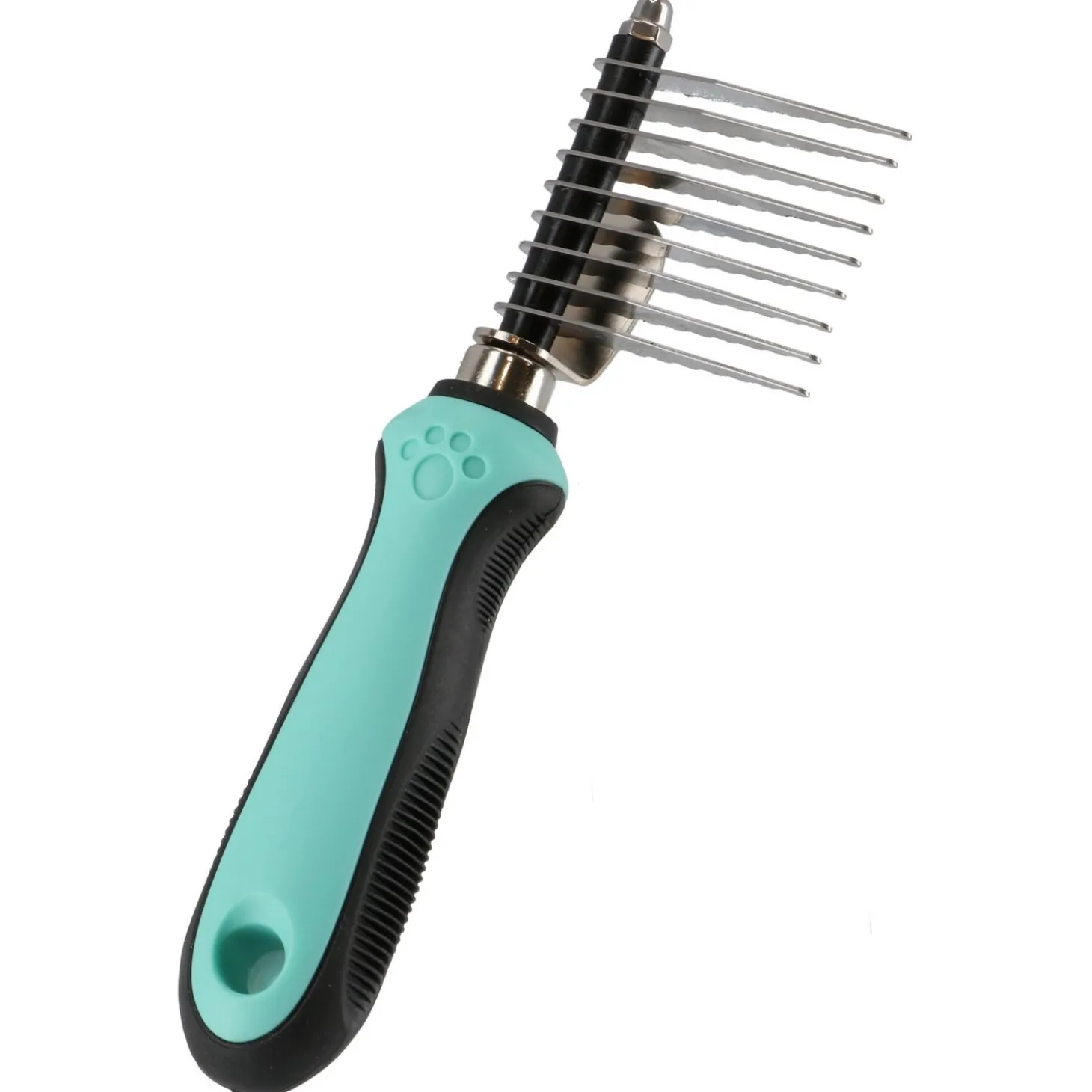 Deze professionele vacht-ontvilter combineert effectieve klit- en viltverwijdering met optimaal gebruiksgemak. Het innovatieve ontwerp met duimbescherming zorgt ervoor dat je langere tijd comfortabel kunt werken zonder drukpunten of vermoeidheid, zelfs bij hardnekkige viltproblemen. De getande, golvende mesjes snijden zachtjes door verharde klitten en viltplekken zonder aan de vacht te trekken of de huid te beschadigen. Het ergonomische turquoise handvat biedt een stevige grip en nauwkeurige controle, waardoor je ook op gevoelige plekken veilig kunt werken.