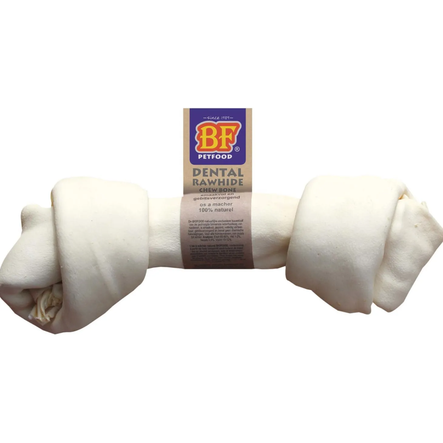 Een groot voordeel van runderhuid kluiven is dat de kluif zachter wordt wanneer je hond er op begint de kluiven. Het stimuleert de speeksel aanmaak bij je hond en het speeksel trekt in de kluif waardoor het zachter wordt. Runderhuidkluiven zijn geschikt voor jong en oud, wel is van groot belang om het juiste formaat kluif bij je hond te kiezen. De Dental Knoop van Biofood bestaat uit opgerold runderhuid met aan beide kanten een knokkel. De knokkel biedt extra kauwplezier voor de fanatieke kauwers.