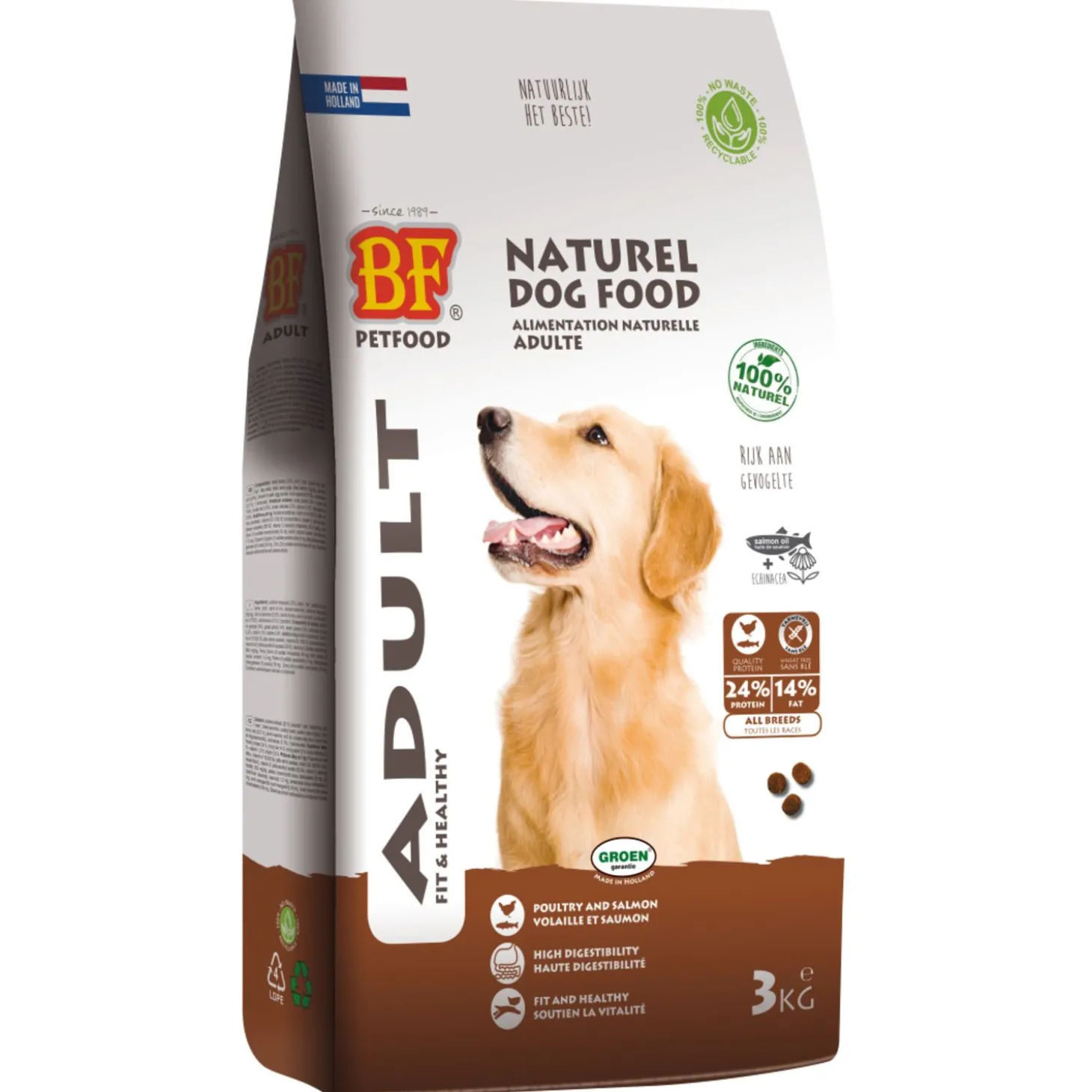 Er werd bij de start van het Friese bedrijf Biofood Diervoeding BV al direct ingezet op natuurlijke ingrediënten met als grondslag ‘respect voor dier, natuur en milieu’. Biofood gebruikt 100% natuurlijke en biologische grondstoffen in de smaakvolle hondenvoeding van Nederlandse bodem. Daarbij maken ze gebruik van het GROEN-garantie-label. De kwaliteit en de natuurzuiverheid worden hierdoor gewaarborgd. Uniek zijn de vernieuwde duurzame ‘no waste’ verpakkingen. Deze zijn van gerecycled mono materiaal gemaakt wat wederom recyclebaar is.
