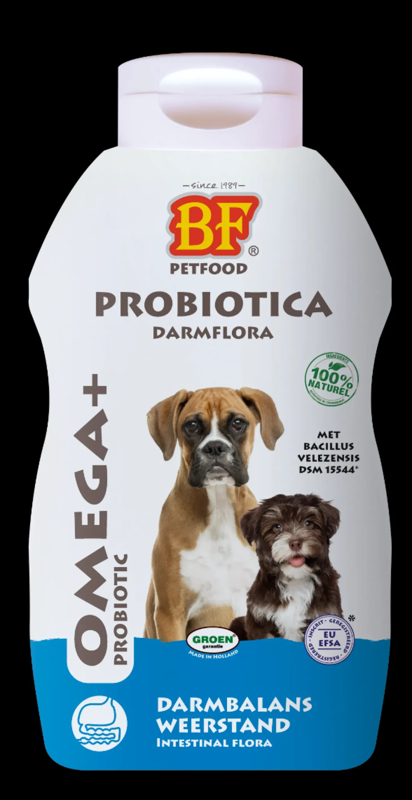 Probiotica van Biofood is een natuurlijk en vloeibaar probiotica product wat zorgt voor een optimale darmbalans en algemene gezondheid van je hond. De probiotica ondersteunt de weerstand (bijv. na een antibioticakuur), spijsvertering en stoelgang. Deze Probiotica bevat Bacillus subtilis C-3102 probioticum. Dit zijn goede bacteriën die zorg dragen voor de samenstelling van darmeigen bacteriën en zorgen hierdoor voor een betere balans. Het verbetert de omgeving voor goede bacteriën. Dit zorgt voor een betere ontlasting, vermindering van ammoniak in de uitwerpselen en honden gaan beter om met stressmomenten (bijv. omzetting naar andere voeding). Geschikt voor alle hondenrassen van pup tot senior.