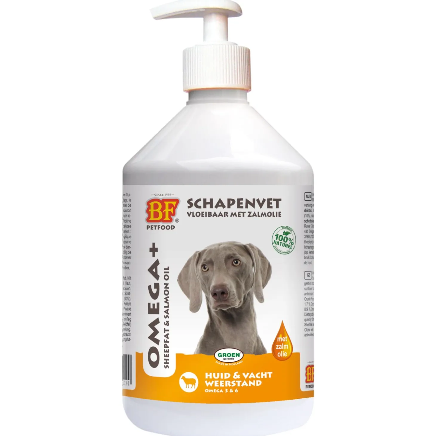 Het toevoegen van Schapenvet aan een goede voeding is altijd een goede keus. Schapenvet bevat ongeveer 58% verzadigde vetzuren en ongeveer 32% enkelvoudig onverzadigde vetzuren. Vet is niet alleen een smaakmaker maar ook belangrijk bij het transport van vitamine A, D, E en K in het lichaam. Het vetmetabolisme van een hond gaat zeer efficiënt om met vet en zet dit gemakkelijk om in energie. De originele Vloeibaar Schapenvet van Biofood is een natuurlijk product. Een mooie combinatie van schapenvet, zalmolie en zonnebloemolie. Door de toevoeging van zalmolie bevat het ook belangrijke omega 3 en 6 vetzuren. Schapenvet is goed in te zetten ter ondersteuning van afweer, huid, vacht, (spijs)vertering en weerstand. Schapenvet is een erg gezonde en smaakvolle toevoeging op de dagelijkse voeding van je hond. Ook geschikt voor honden met een voedselallergie.