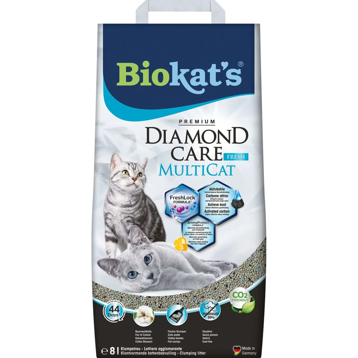 - Biokat’s Diamond Care MultiCat fresh is bij uitstek geschikt voor de hoge eisen van meerkatten huishoudens.