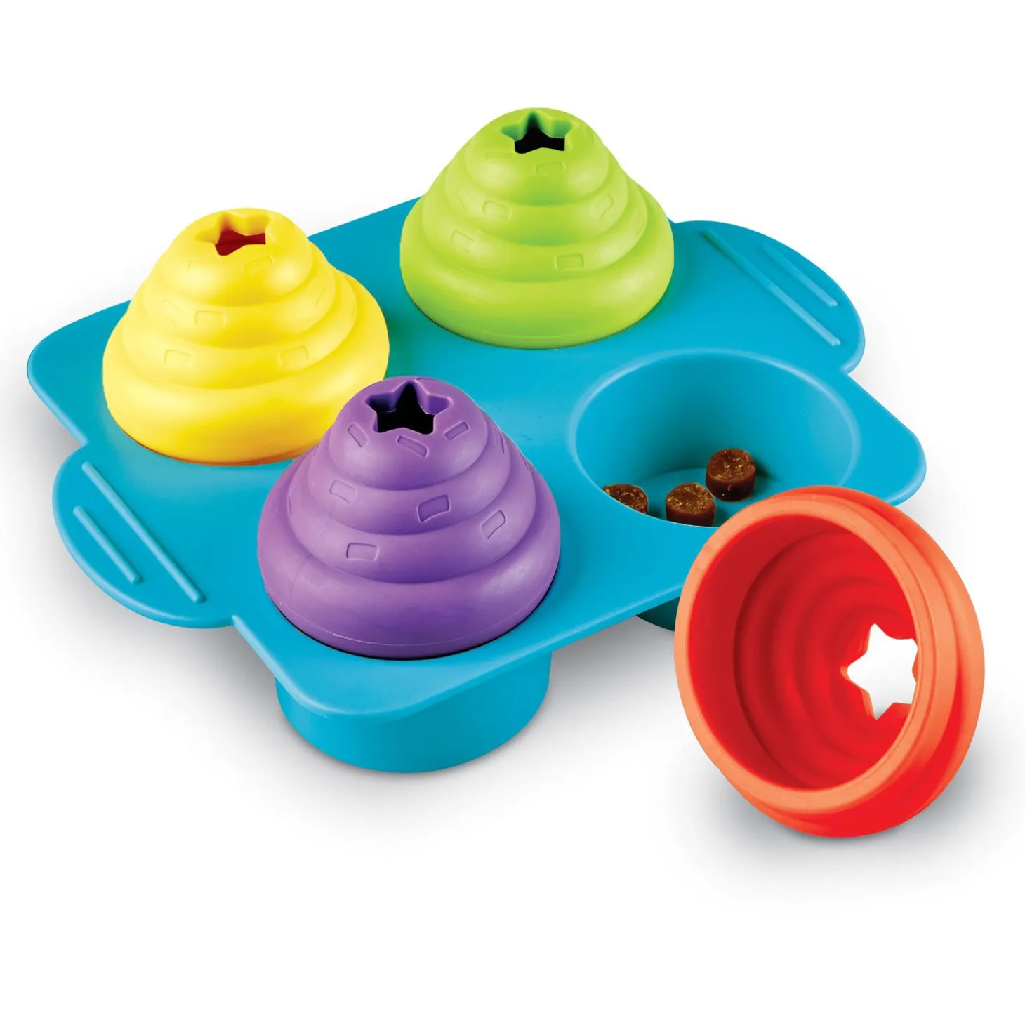 Je legt de brokjes of snacks van je hond op het dienblad, met de cupcakes er bovenop. Je hond moet dan nadenken hoe hij het voer eruit kan krijgen. Hij/zij zal hierbij de neus of poten moeten gebruiken om dit voor elkaar te krijgen. Dit soort voerspeeltjes remt de snelle eters af en kan daardoor maagklachten voorkomen. Dit hondenpuzzelspeelgoed is gemaakt van gemakkelijk schoon te maken, BPA-vrije materialen.