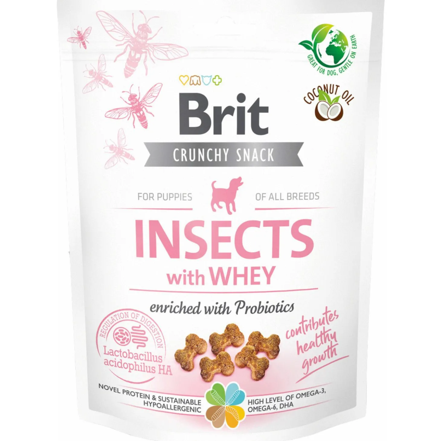 | Samenstelling | Composition: insect protein (26%), peas, whey (14%), potato starch, coconut oil, pea protein, linseed (5%), hydrolyzed chicken liver, dried algae (2%, Schizochytrium limacinum), dried apple pulp, rapeseed oil, Lactobacillus acidophilus HA – 122 inactivated (15×109 cells/kg). |