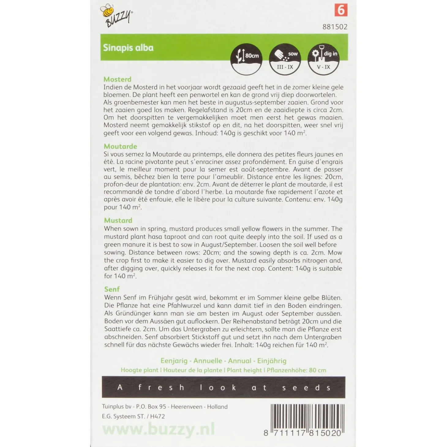 * Zaai vanaf 1/2 augustus tot en met eind september. * Voor 1m2 heb je 1 gram nodig. Verpakking is geschikt voor 140m2* Bij laat zaaien geeft het gewas geen zaden meer en in de winter vriest het gewas dood.Groenbemesting is het telen van gewassen op een stuk grond om dit vervolgens onder te ploegen of te mulchen. Dit wordt gedaan om het percentage organische stof en het stikstofgehalte in de bodem te verhogen. Een deel van die organische stof wordt vevolgens in de bodem omgezet in humus.