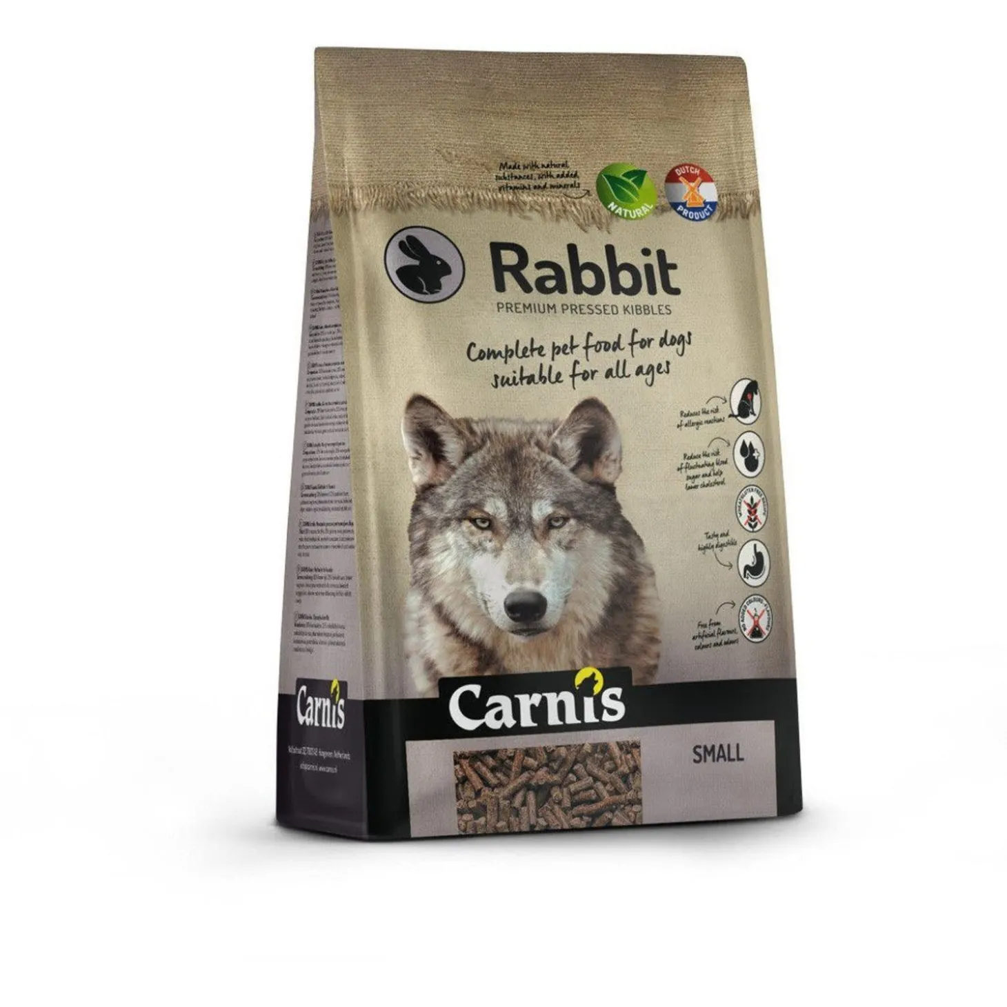 Carnis Droogvoeding Geperst Rabbit is hoogwaardige, geperste hondenvoeding op basis van konijn en is geschikt voor honden van alle leeftijden en rassen. Zo geniet West Highland White Terriër Bobbie bijvoorbeeld van het kleine formaat brokjes (Small) en Akita Yuna van de grote brokken (Regular).