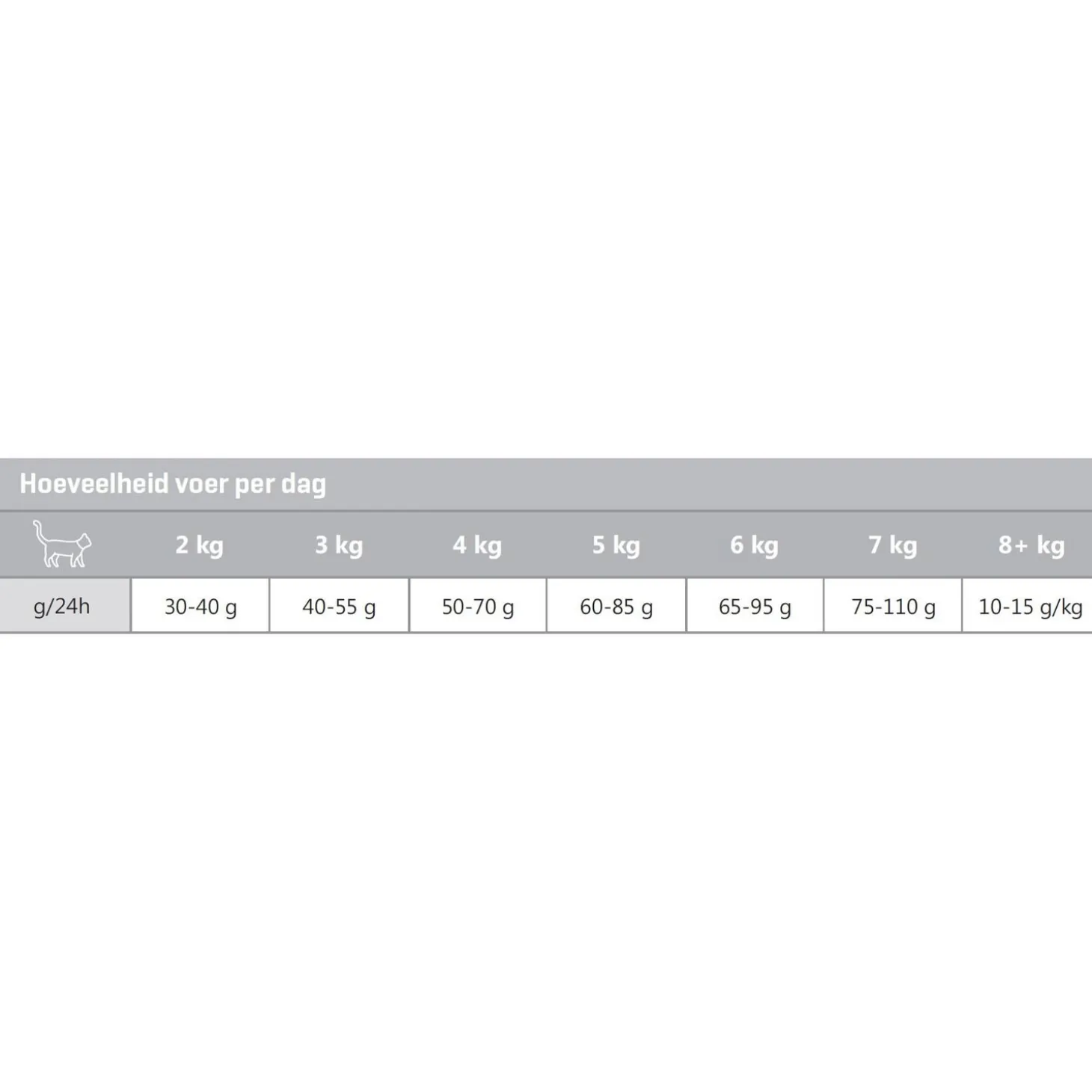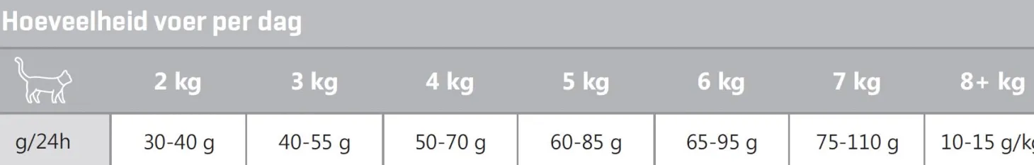 | Aanbeveling | Volg het voedingsschema in de tabel, maar pas eventueel de voerhoeveelheid aan om het ideale gewicht van uw kat te handhaven. Verdeel de dagelijkse voerhoeveelheid over twee of meer maaltijden per dag. Houd de conditie van uw kat steeds goed in de gaten en zorg dat er altijd vers en schoon drinkwater beschikbaar is. |