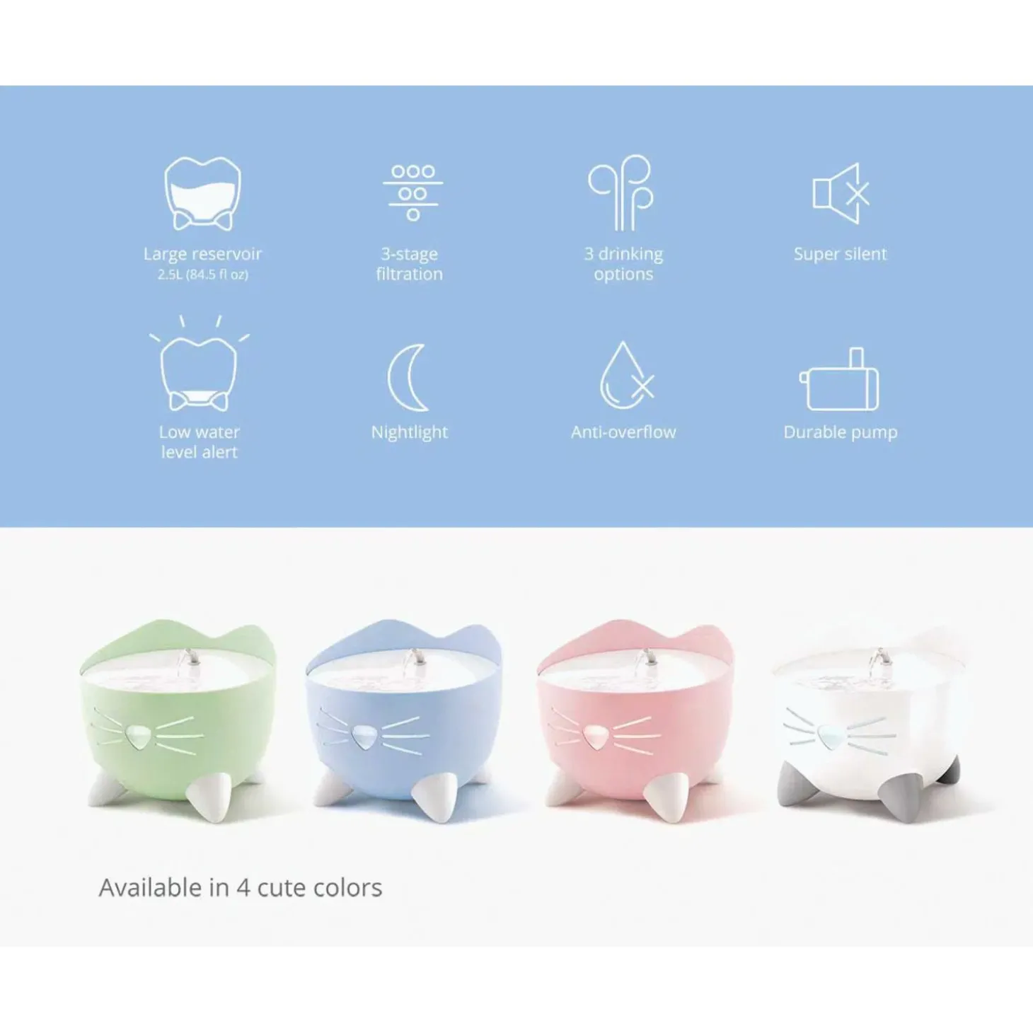 Sommige katten vinden stromend water nou eenmaal lekkerder smaken dan stilstaand water, het houdt het water interessant en vers. De Pixi Fountain is een vrolijke drinkfontein met een schattig kattensnuitje aan de voorzijde. Dankzij de vervangbare triple action-filters blijft het water schoon en zacht (vervang het filter om de drie weken).