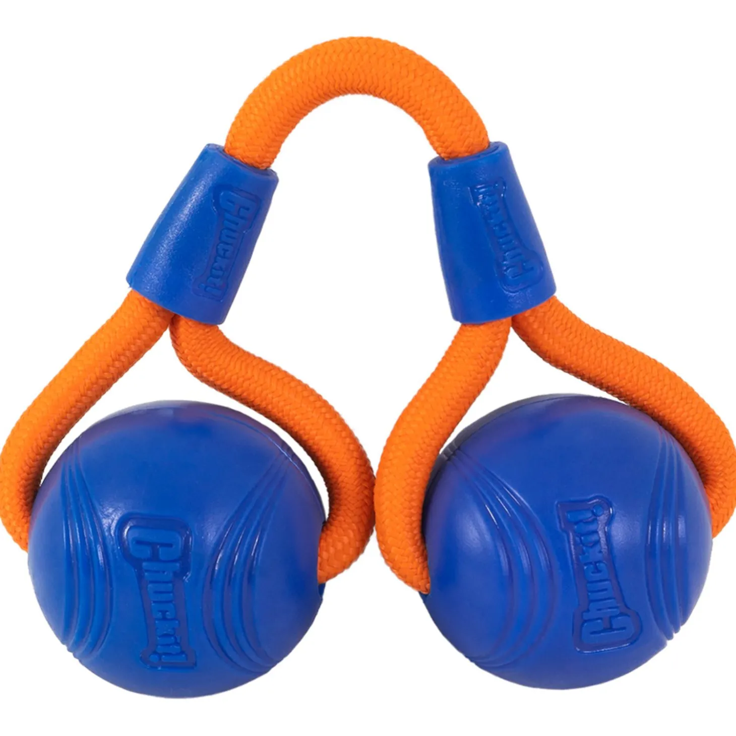 - Dankzij het stevige touw kunt u met uw hond een trekspelletje spelen, wat de band tussen u en uw hond versterkt, maar het is ook mogelijk om ermee te apporteren. Dankzij het formaat van de ballen is de Chuckit Crunch ball Duo-tug te combineren met alle Chuckit Ball Launchers in maat M!