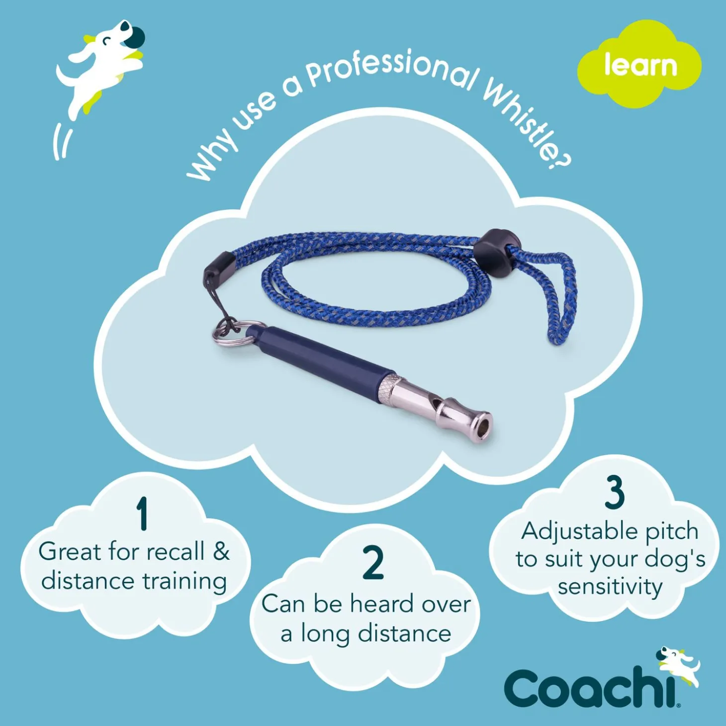 | Analyse | A lightweight whistle which allows you to adjust the pitch, to suit your dog’s sensitivity or change the tone for different dogs, perfect for dog trainers and professionals. It is easy to change the pitch on the Professional Whistle, simply separate the 2 parts of the whistle, rotate the nut to adjust pitch and secure both parts back together. Whistles are great for recall training as they help to standardise commands and are great if different people are training or walking the same dog. Super-light and compact in design, the Professional Whistle can easily be slipped in a pocket or treat bag to ensure you always have it to hand. The attractive corded lanyard is fully adjustable so you can secure at the desired length and it is reflective too! The Coachi range was created by the experts at Company of Animals and it is designed to focus on promoting effective, humane and positive methods, making training simple and rewarding for both owners and their dogs. |