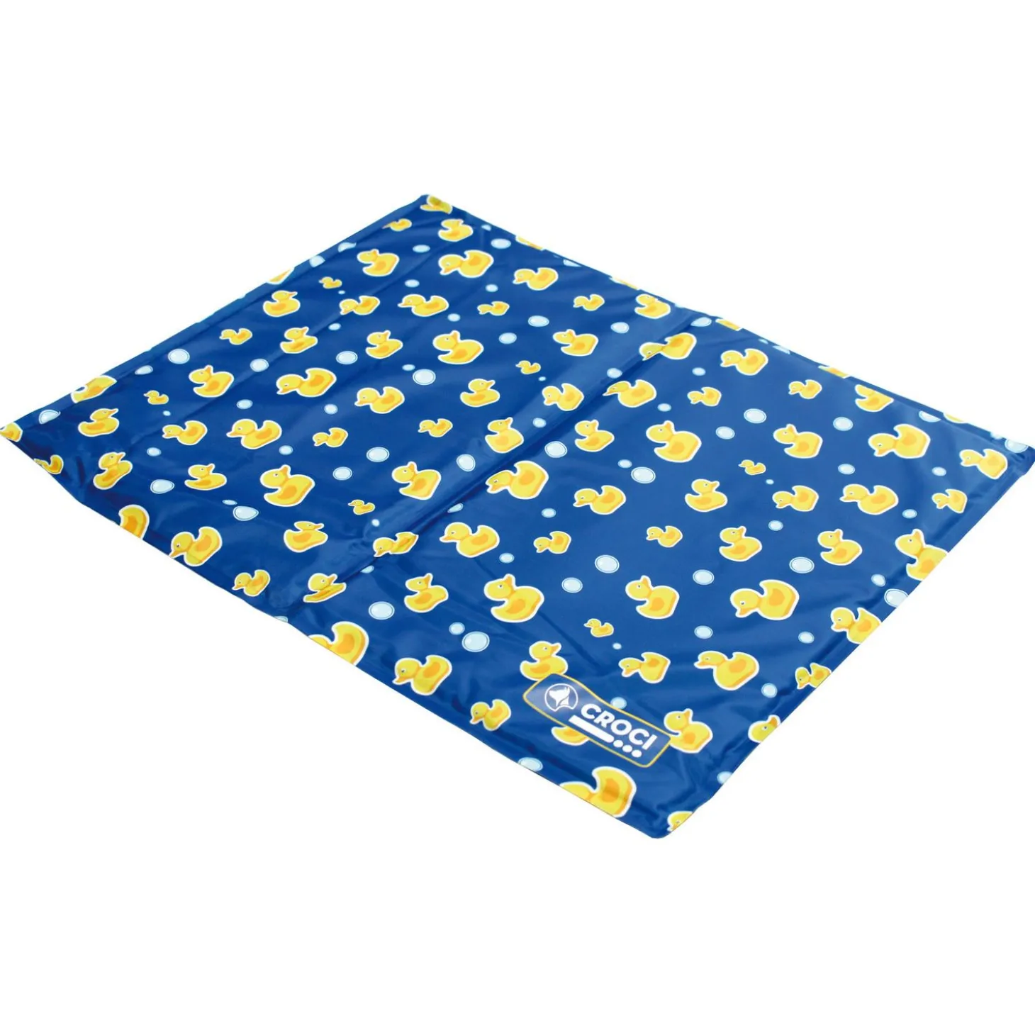 De blauwe koelmat van Croci is heeft een vrolijke opdruk met badeenden.