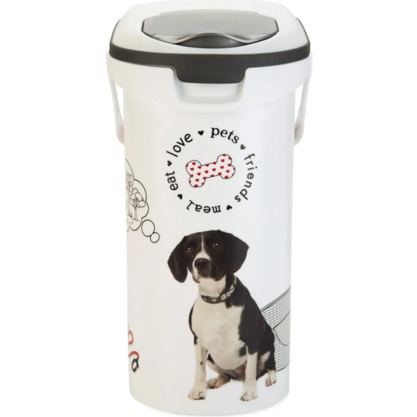 Om te voorkomen dat de brokjes van jouw hond (of kat) oud en vies worden, kan je ze bewaren in een voercontainer. De Voercontainer van Curver is een hoogwaardige voerton waar je de brokken van je hond in kunt bewaren. Aan de buitenkant vind je een vrolijke hondenopdruk zodat de container leuk is om naar te kijken.