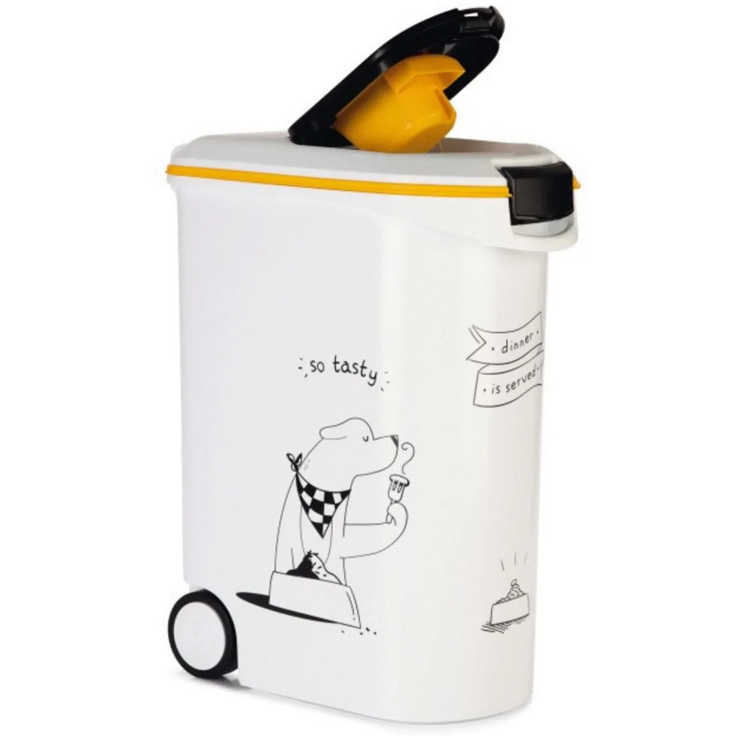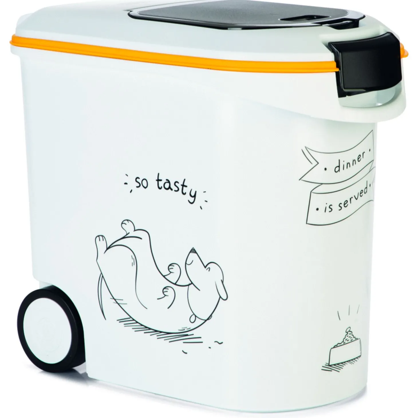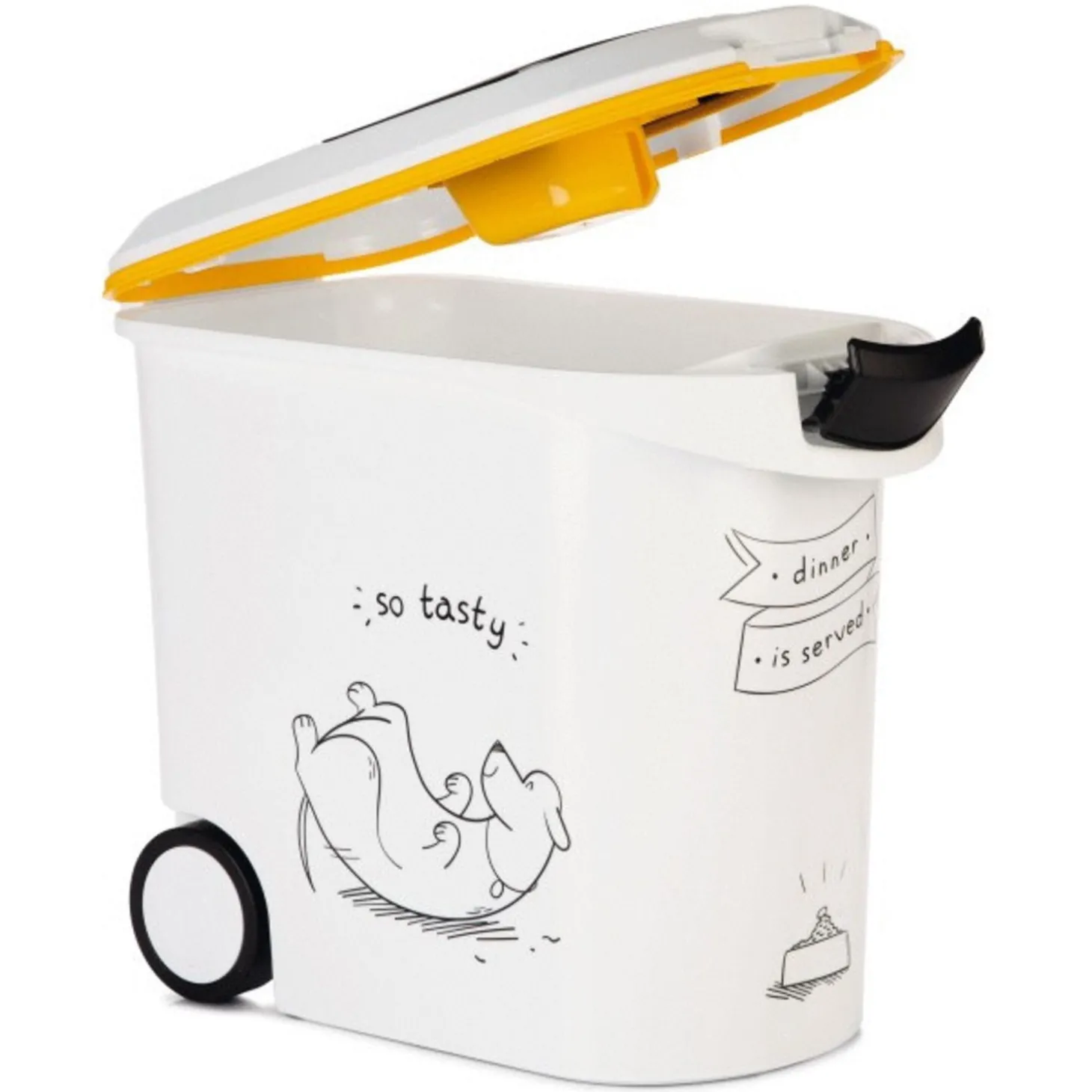 Om te voorkomen dat de brokjes van jouw kat (of kat) oud en vies worden, kan je ze bewaren in een voercontainer. De Voercontainer So Tasty van Curver is een hoogwaardige voerton waar je de brokken van je hond in kunt bewaren. Aan de buitenkant vind je een vrolijke hondenopdruk zodat de container leuk is om naar te kijken.