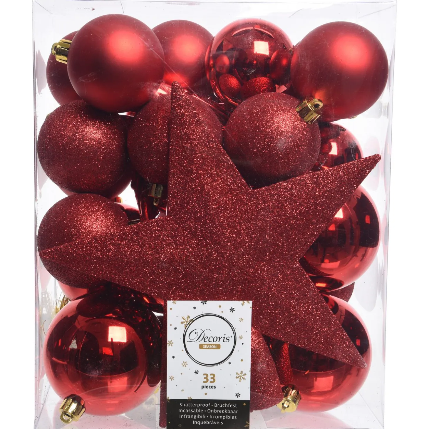 De kerstbal mag natuurlijk niet ontbreken in de feestperiode, zoals de Kunststof Kerstballen van Decoris. Een handige set van 33 kerstballen in verschillende vormen. De ballen zijn mat, glitter en glanzend.