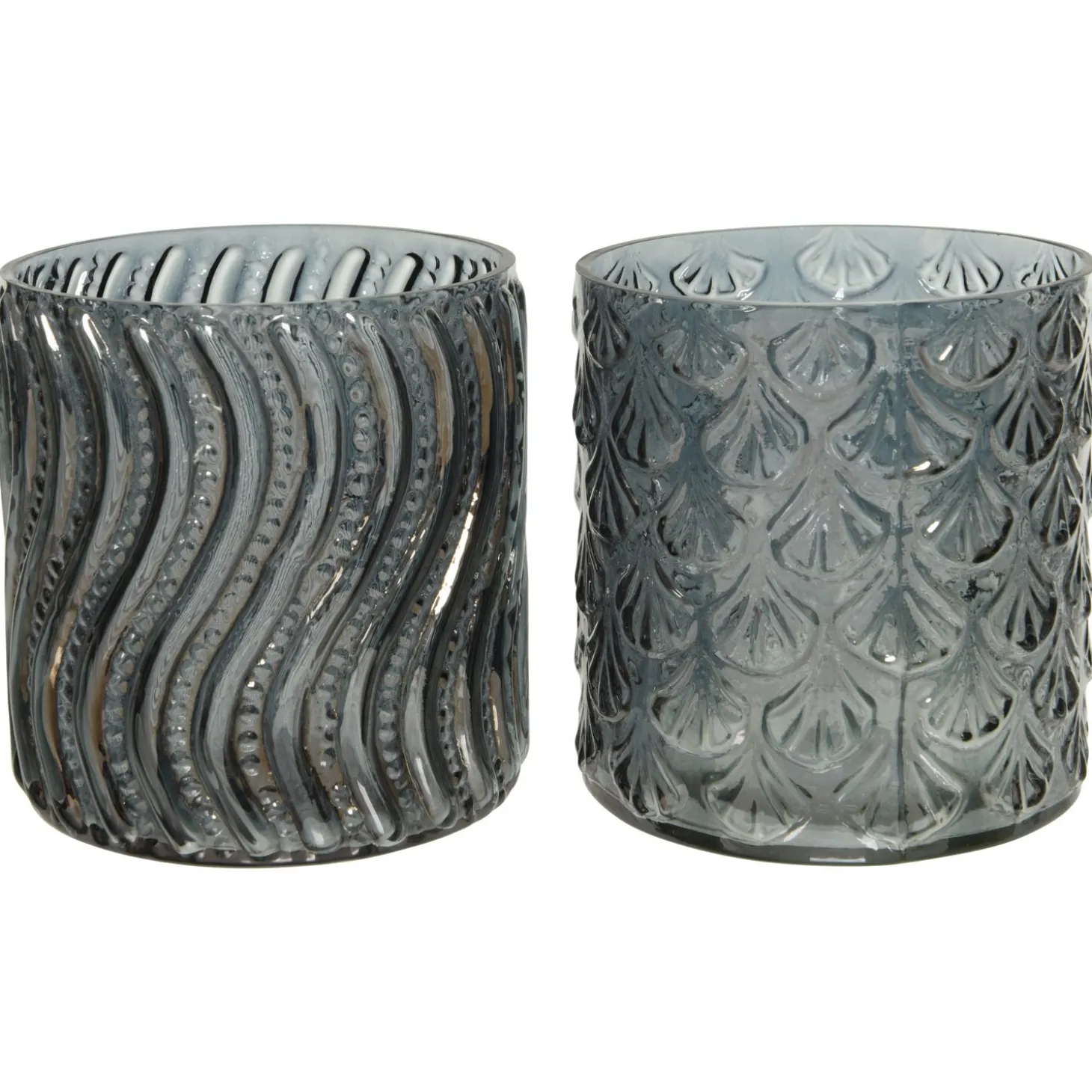 Om een knusse winterse avond te hebben, heb je theelichtjes nodig. Deze Theelichthouder van Decoris is eengrijzewaxinelichtjeshouder, met kronkel strepen of met waaier vormpjes.