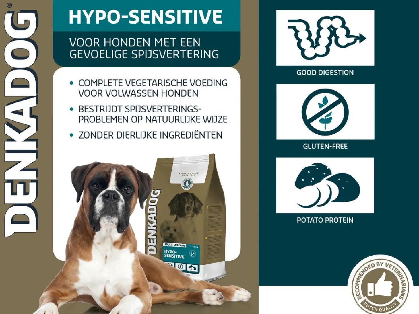 Denkadog Hypo-Sensitive isspeciaal voor honden met een gevoelige maag en bevat geen dierlijke eiwitten en vetten en is glutenvrij.