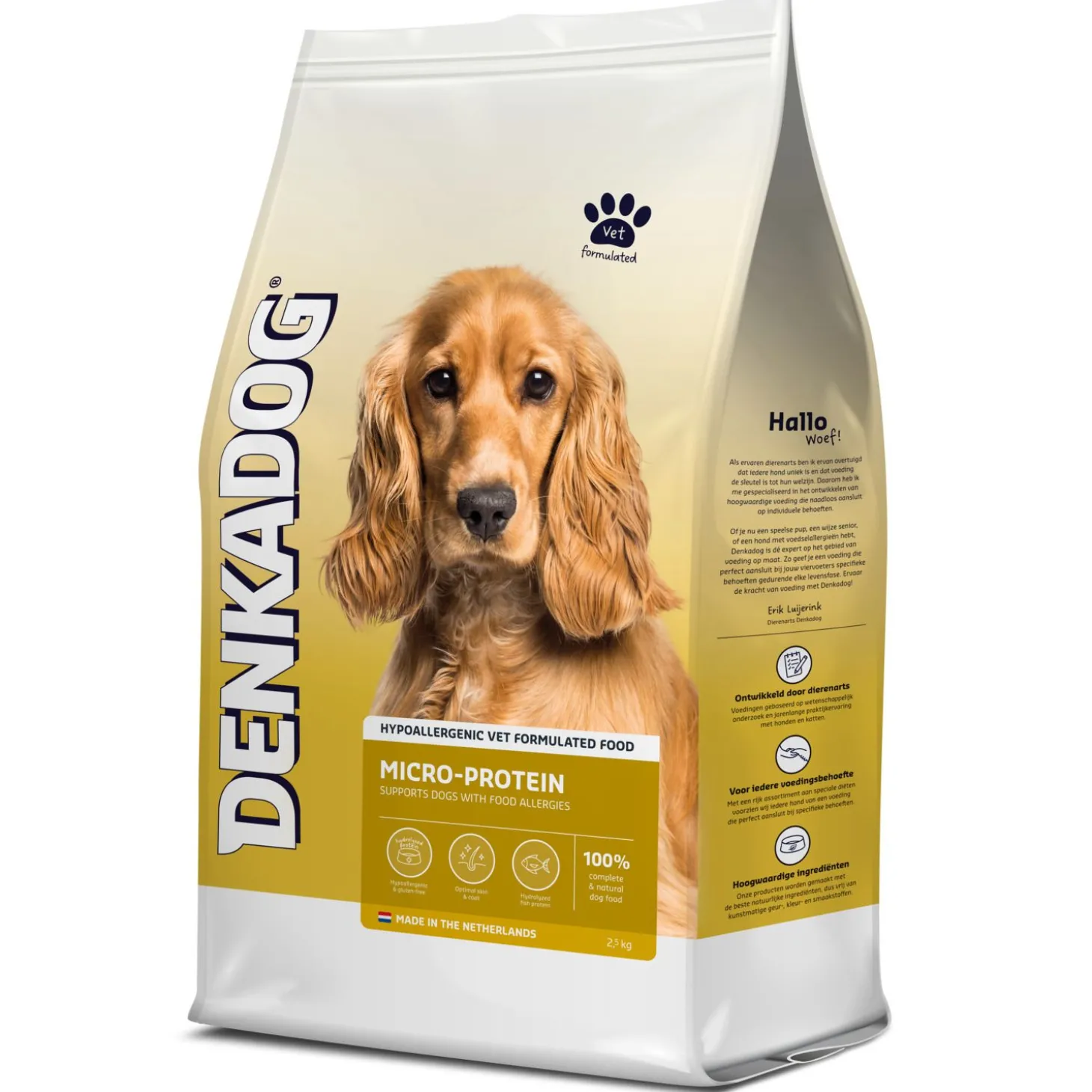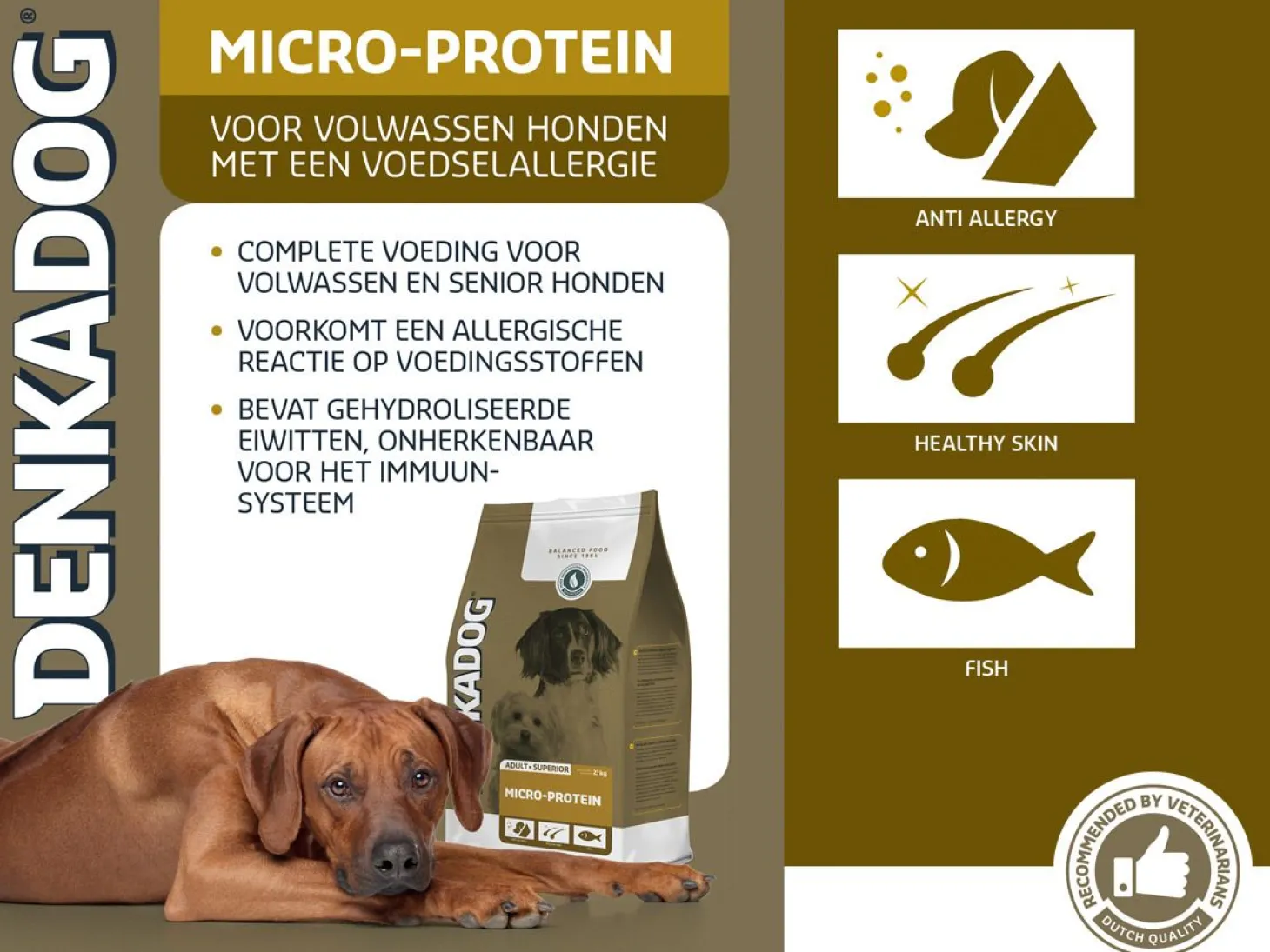 Denkadog Micro-Protein bevat vis-eiwitten die zo klein zijn, dat ze geen allergische reactie opwekken, maar wel de juiste voedingswaarde bevatten.