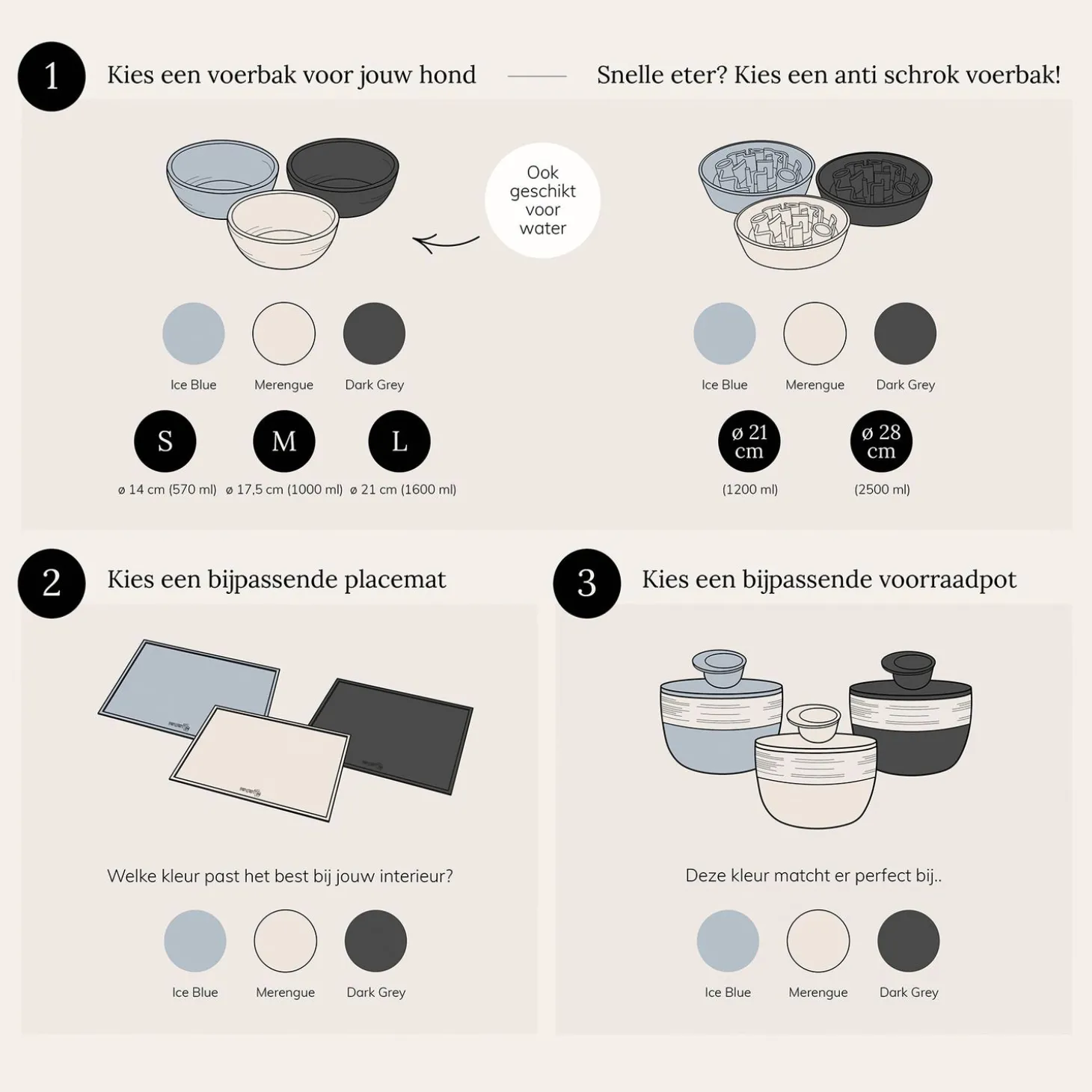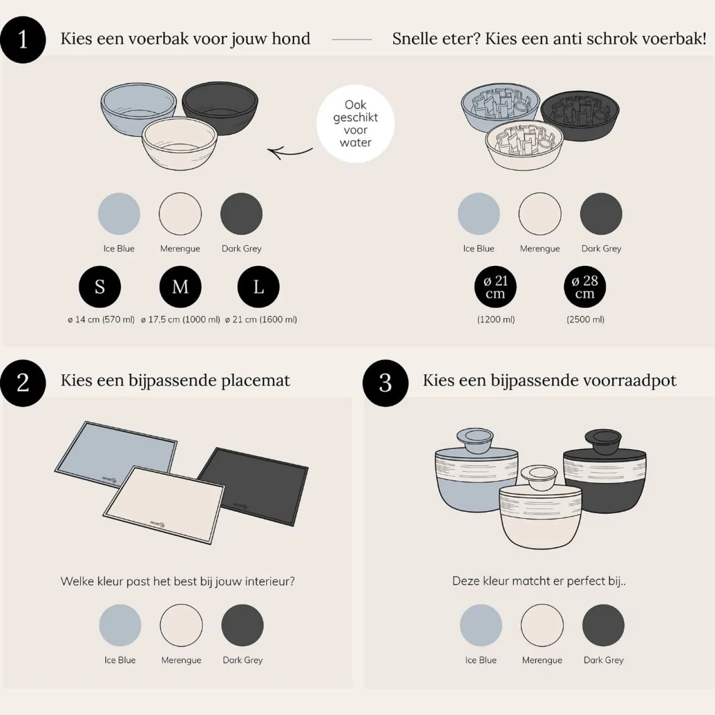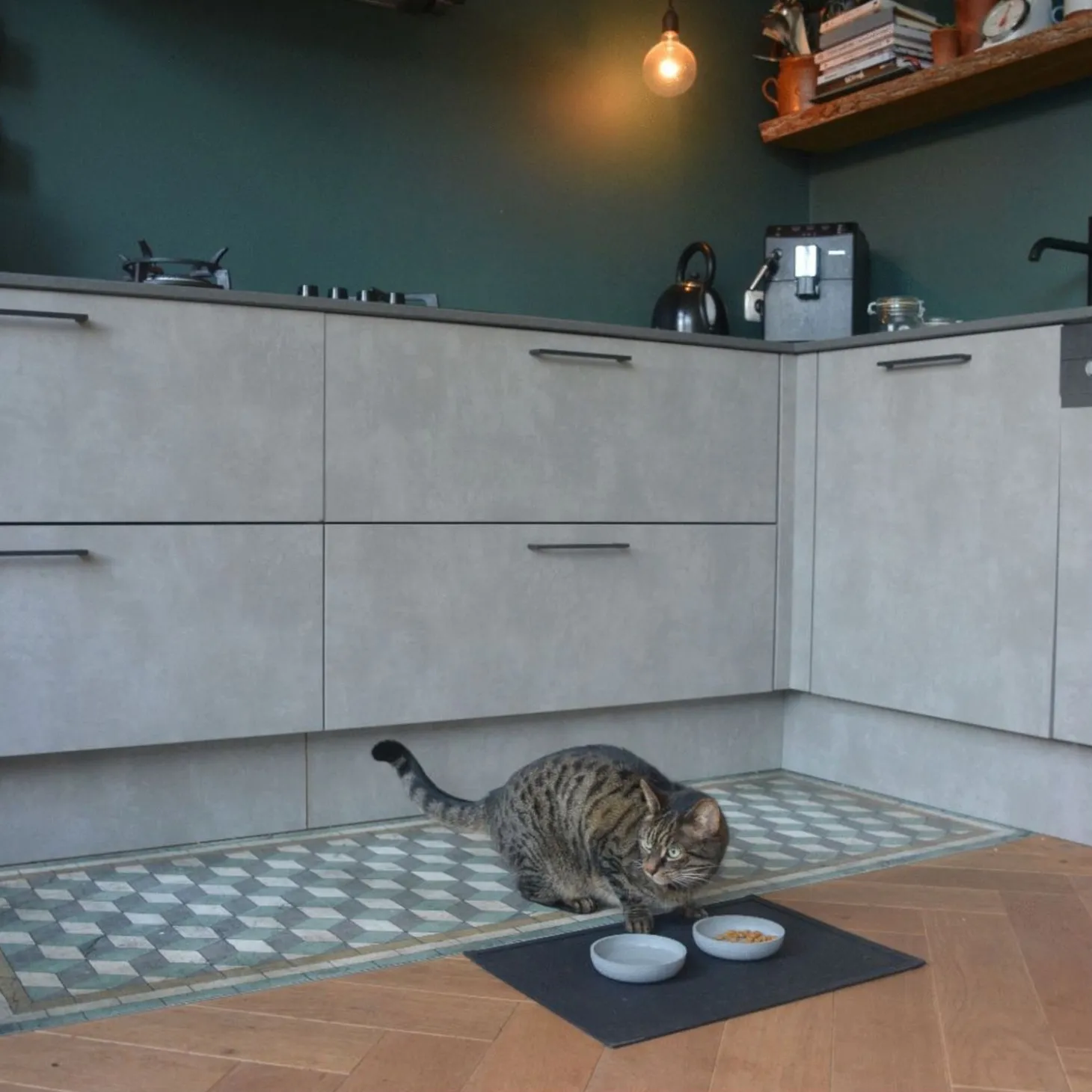 Op de placemat passen precies twee voerbakken, met een maximale diameter van 21 centimeter. De kleur van de placemats passen bij elk interieur, waardoor het een hippe aanvulling is. Ook kan je eindeloos combineren met verschillende voerbakken op de placemats.