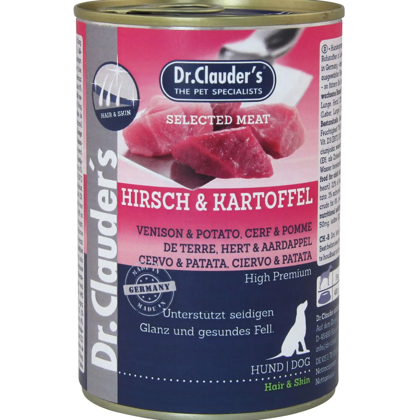 | Samenstelling | Ingrediënten: 44% hertenvlees, 22% eend (spiervlees, lever), 22% varken (lever, long), aardappel 10%, zalm olie 1%, mineralen 1%.Toevoegingsmiddelen/kg: Nutritionele toevoegingsmiddelen: vitaminen: D3 (E671) 200IE, E (alphatocopherolacetat) 50mg, jodium (E2, als calciumjodaat, watervrij) 0,2mg, mangaan (E5, als mangaan (II) sulfaat) 2mg, zink (E6, zinksulfaat, monohydraat) 20mg. |
