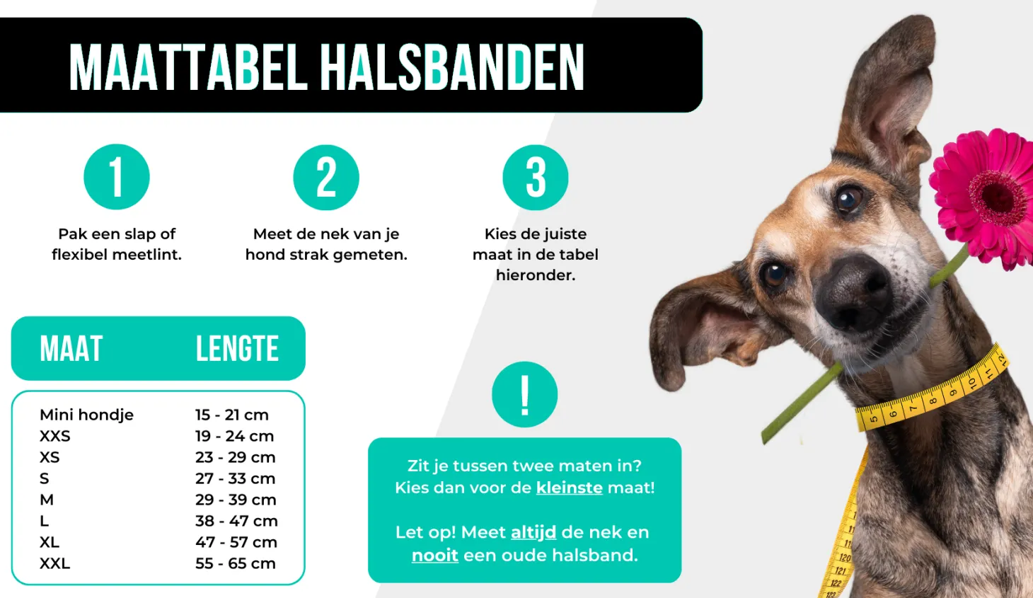 De Sweet Mae is verkrijgbaar in verschillende maten. Bij het kiezen van een maat kies je uit de verstelbare lengte van de halsband en de breedte van de band.